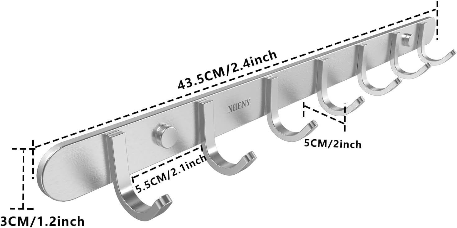 Coat Hook Hanger Wall Mounted 17-Inch Towel Hook Rack with 7 Hooks, Easy Installation Rail for Bedroom, Bathroom, Foyer, Hallway, Office, Rust and Water Proof (Stainless Steel Brushed Nickel)