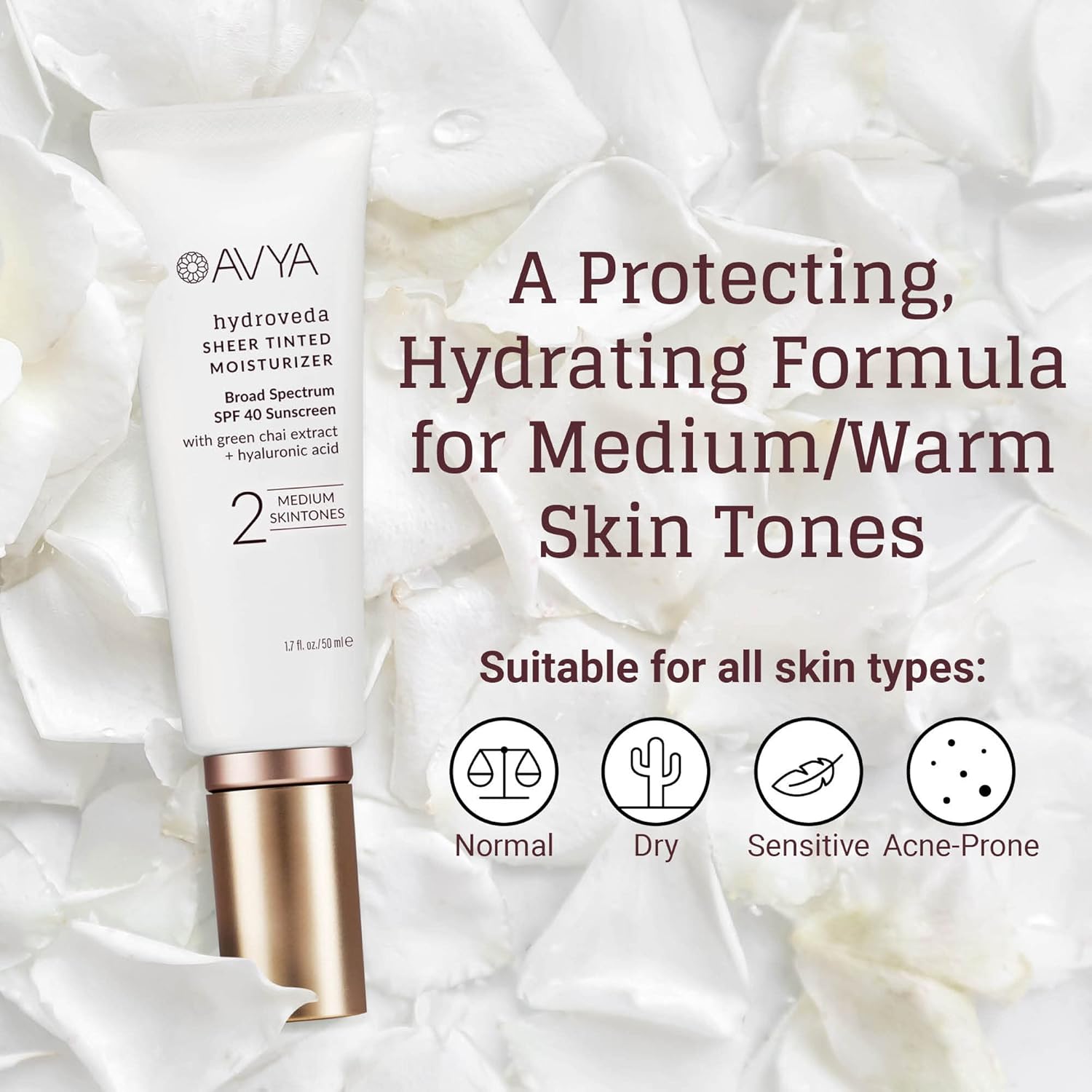 AVYA SPF 40 Sheer Tinted Moisturizer with Hyaluronic Acid & Green Chai – Advanced Ayurvedic Skincare Treatment for Balanced and Brighter Skin/Medium Skintones Shade #2 (1.7oz/50ml)