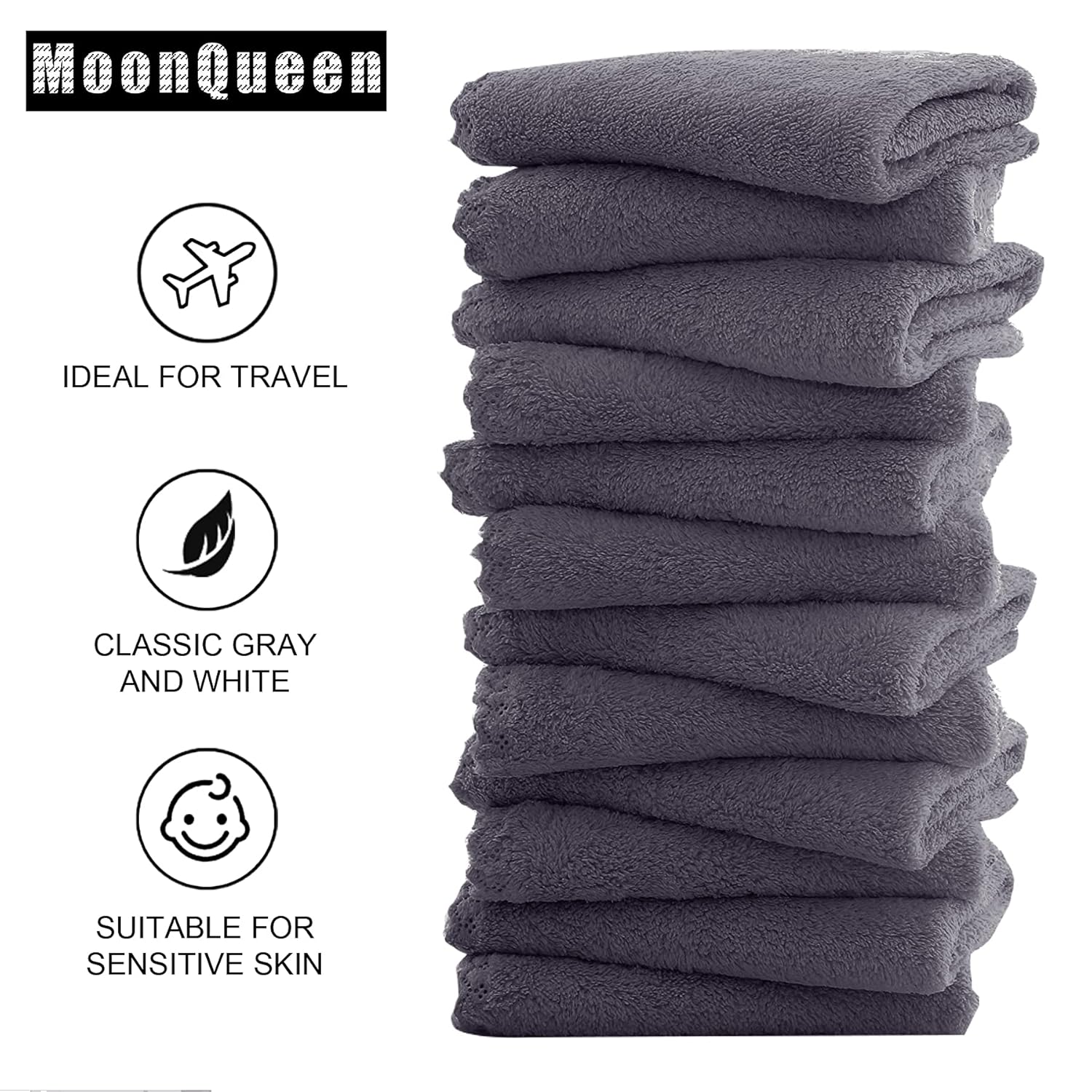 MOONQUEEN Microfiber Facial Cloths Fast Drying Washcloth 12 Pack - Premium Soft Makeup Remover Cloths - Grey