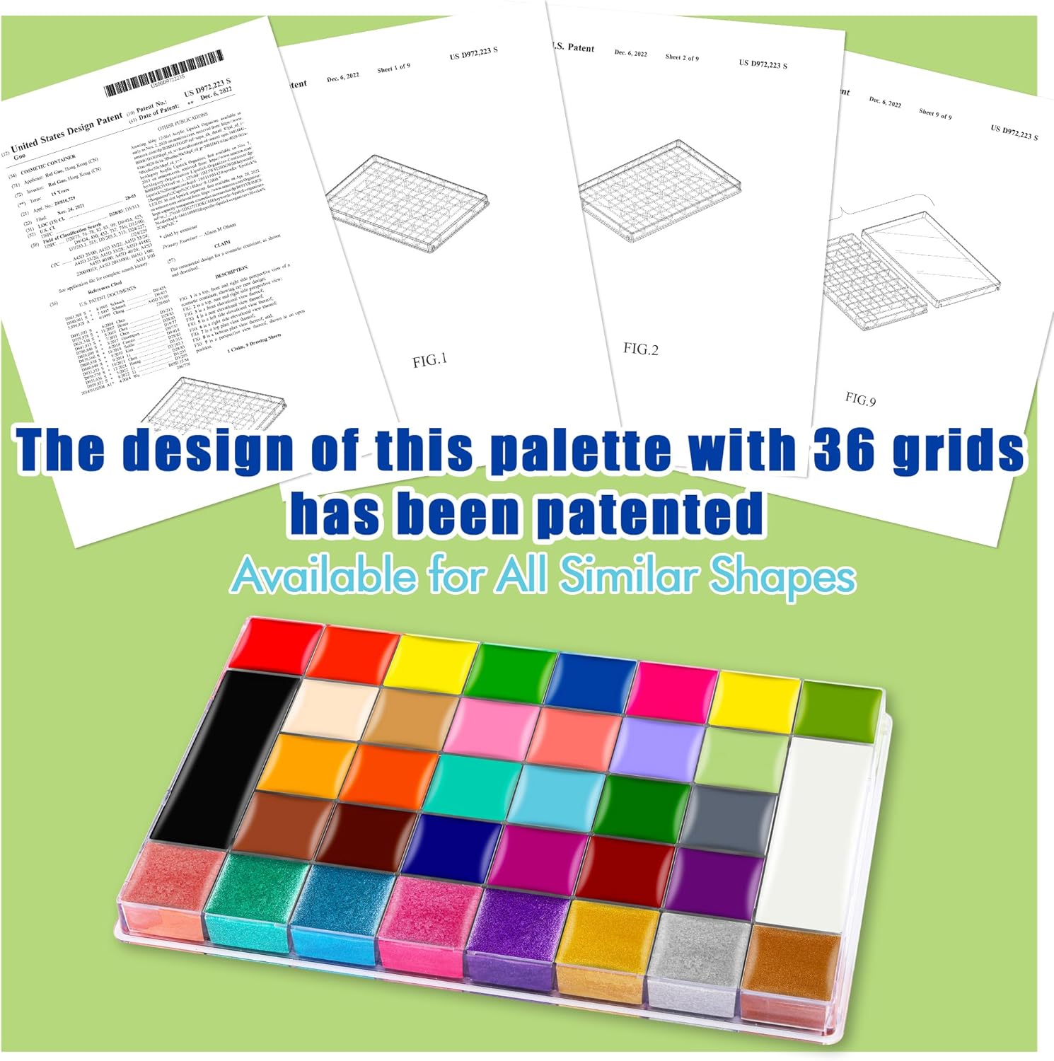 - 36 BRIGHT COLORS & BEST CREME FACE PAINTING KIT - Includes 36 premium vibrant colors that are striking without cracking,comes with 10pcs high quality artist brushes.With a great selection of colors, Such as 22 Vivid Classic + 8 Metallic + 6 Neon UV Glow Colors which is reactive under UV or Black light. Best & Big enough to meet the needs of different occasions. Even more, effortlessly blend them for over 36+ amazing colors to create more paintings with your endless imaginations.
