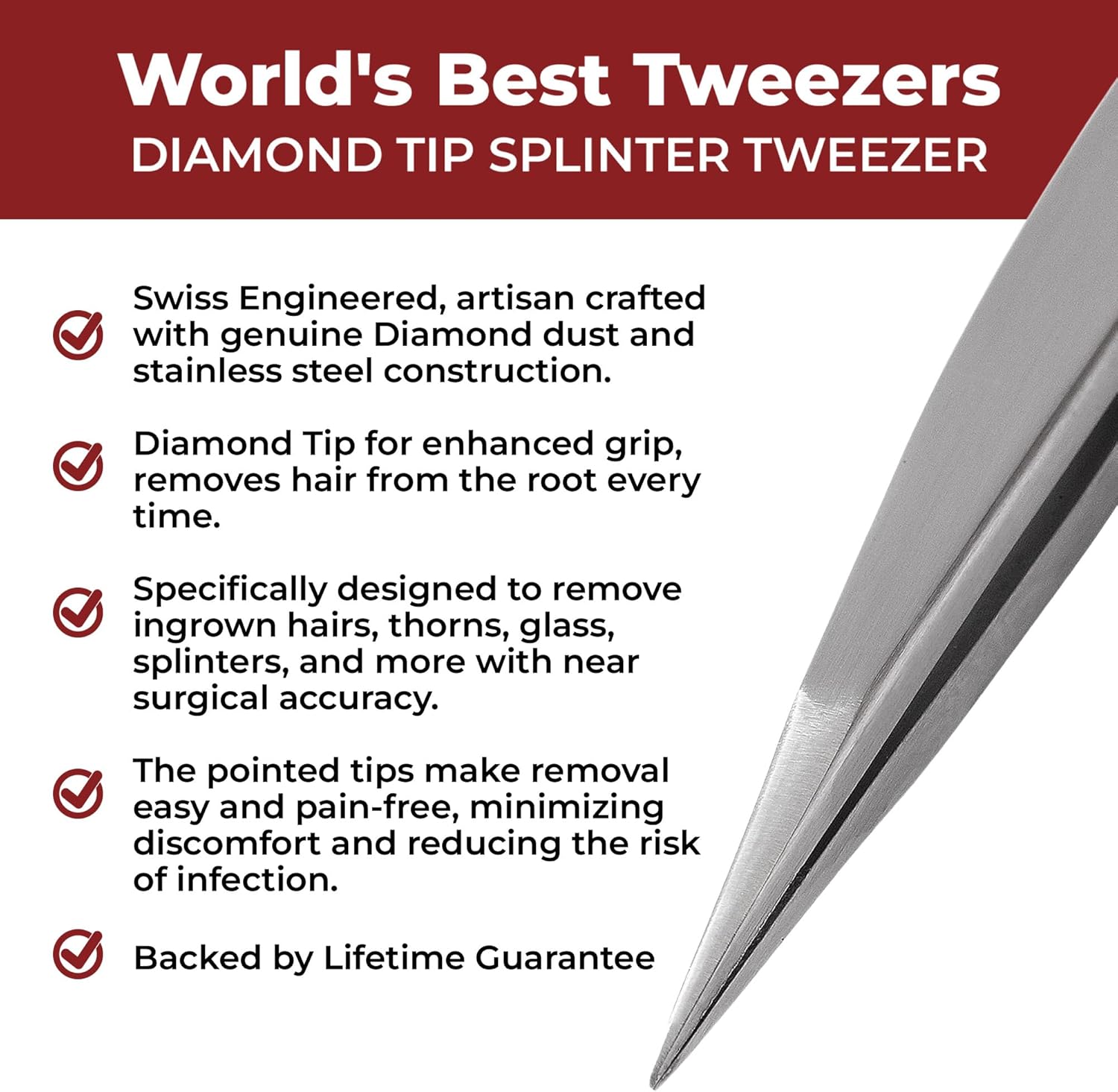 - High Precision Diamond Tip Design: World’s Best Tweezers Splinter Out Needle Nose Tweezers are crafted with a fine point, high-precision diamond tip for unmatched accuracy. Perfect for ingrown hair, splinter, and tick removal, the needle nose design provides precise direction even the smallest objects with ease. A must-have for facial care and beauty routines.
