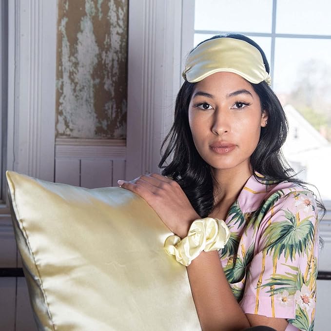 Vegan Silk Sleep Set, Silky Pillowcase with Large Scrunchie and Eye Mask for Hair and Skin, Self Care Essential Satin Night Routine Kit (Light Yellow Color)