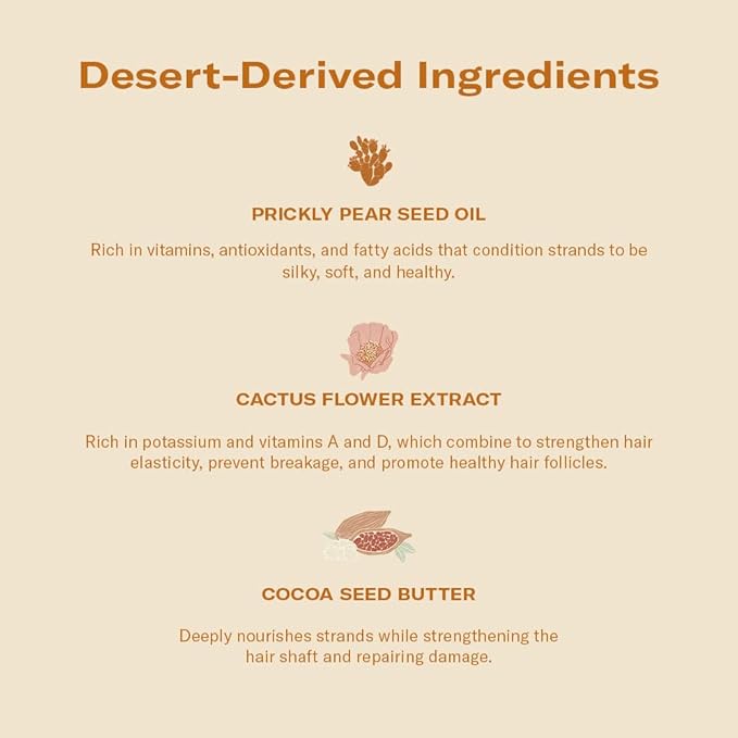 - KEY INGREDIENTS - Cactus Flower Extract: Strengthens hair elasticity, & prevents breakage. Cocoa Seed Butter: Nourishes strands, strengthens the hair shaft, & repairs damage. Prickly Pear Seed Oil: Conditions strands to be silky, soft, & healthy.