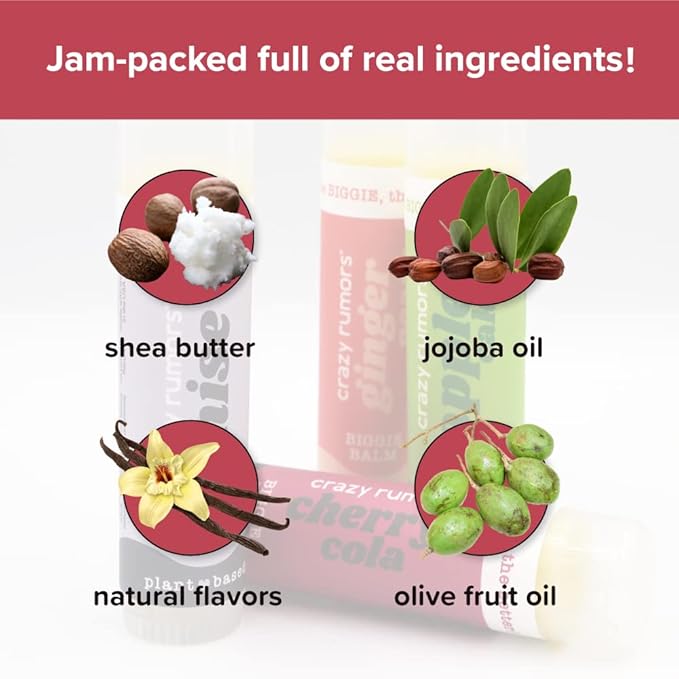 - ๐ฆ ULTRA MOISTURIZING: made with organic premium shea butter and jojoba for long lasting moisture and 100% natural ingredients ๐ฑ. Crazy Rumors lip balms all contain 100% natural, certified organic ingredients, NON-GMO.