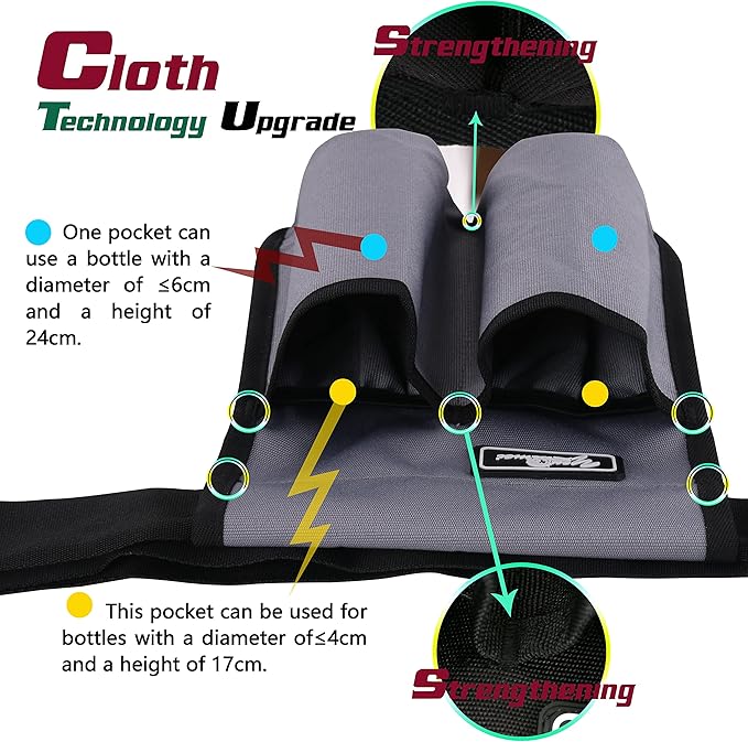 - 3. Design: * There are 5 pockets in the bag design. There are two large pockets and two small pockets on the front, which can be used for bottles of different capacities. The large pockets can be used for bottles with a diameter of ≤2.36inch 9.45inch; in addition, two small pockets. The pocket can hold bottles with a diameter ≤ 1.57 inches and a height of 6.69 inches;