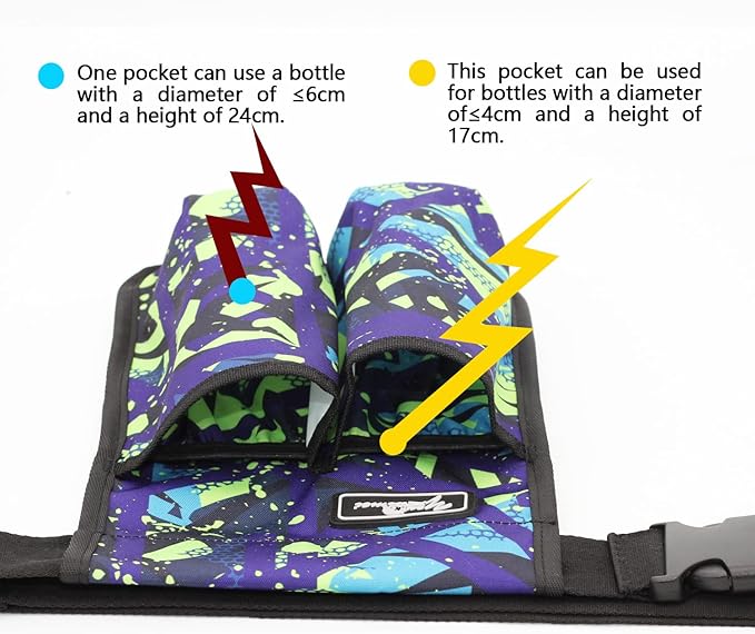 - 3、Design: * There are 5 pockets in the bag design. There are two large pockets and two small pockets on the front, which can be used for bottles of different capacities. The large pockets can be used for bottles with a diameter of ≤2.36inch 9.45inch; in addition, two small pockets. The pocket can hold bottles with a diameter ≤ 1.57 inches and a height of 6.69 inches;