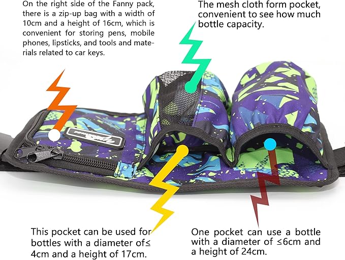 - 3、design: A: The design of the bag has A total of 4 separate pockets, the front has two large pockets and A small hidden pocket can be temporarily used for different capacity bottle, two large pockets available diameter ≤2.36inch 9.45inch high bottle, one of the mesh cloth form pocket, convenient to see how much bottle capacity; Another small hidden pocket can be used for the diameter ≤4cm, 17cm high bottle;