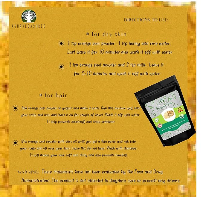 - Various uses of AYURVEDASHREE orange peel powder. Take 1/2-1 tsp powder with coriander seed water or Orange juice or applied as facial scrub/pack with rose water or as directed by health practitioner.
