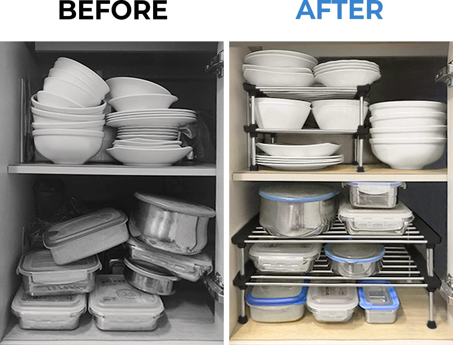 - Maximizes Space and is perfect for organizing plates, cups, bottles, and kitchen clutter. Creates storage space in your kitchen cabinets and countertop, bathroom and more.