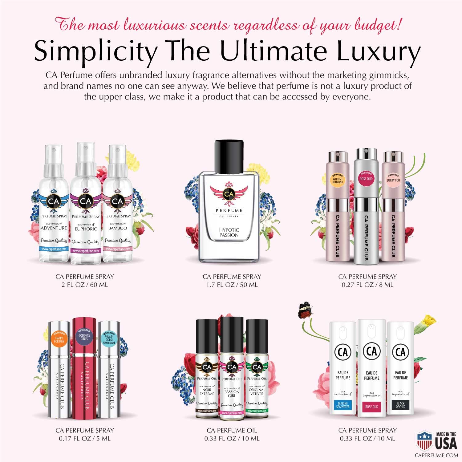 - [ Made in the USA Quality ] Each CA Perfume's Premium Grade Perfume is highly concentrated and expertly developed by one of our master perfumers right here in the USA. We offer a wide range of fragrances to meet every expectation and carry only top-quality fragrances that have the same perfume quality and longevity as the expensive designer brand.