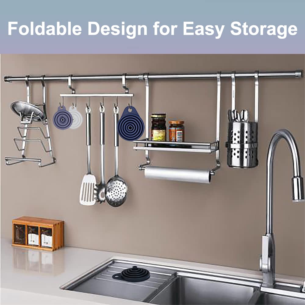 - ●Save Kitchen Space: Collapsible design, Expand to use, collapse to store . You can hang the rubber funnels on the wall or put away in a drawer. All 4 Silicone Folding Funnel take up less room then 1 regular.