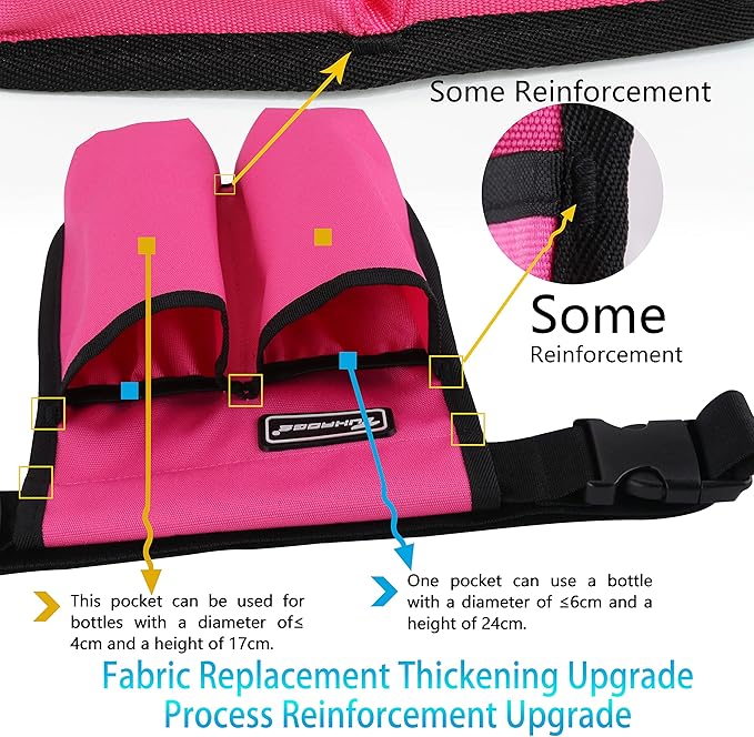 - 3、Design: * The design of the bag has a total of 5 pockets, the front design has two large pockets and two small pockets can be used for different capacity bottle, the large pocket can be used for the diameter ≤2.36inch 9.45inch bottle; In addition, the two small pockets can be used for bottles with diameter ≤1.57inch and height of 6.73inch;