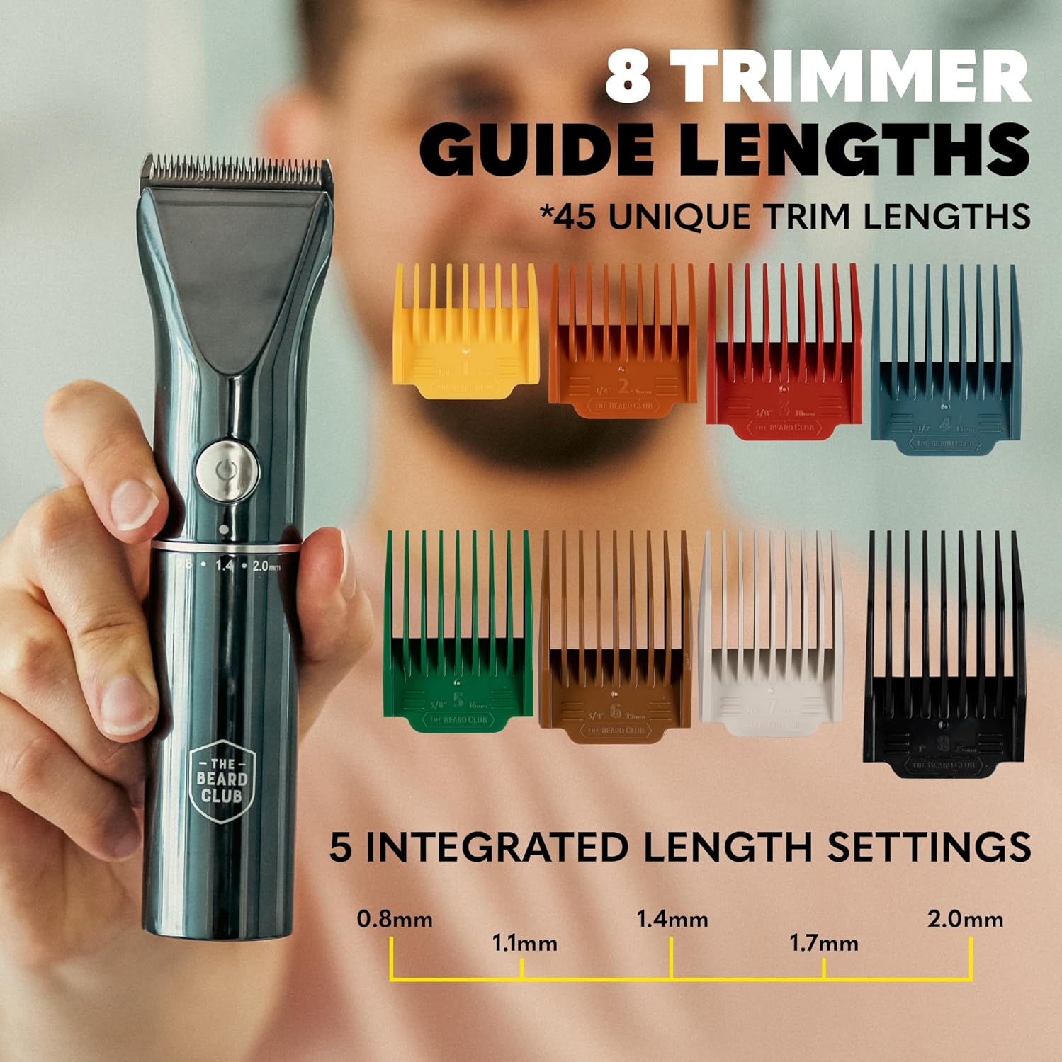 The Beard Club Beard Trimmer for Men - Electric Cordless Rechargeable Beard & Hair Trimmer - High Power 7000 RPM - 8 Color Guides 45 Unique Trim Lengths - Travel Lock