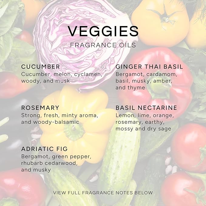 - Our Veggies Fragrance Oil Set is fresh, rich, and warm! It offers a long-lasting scent that fills your home with a fresh and delightful aroma. To last longer, pair with our wooden cap reed diffuser.