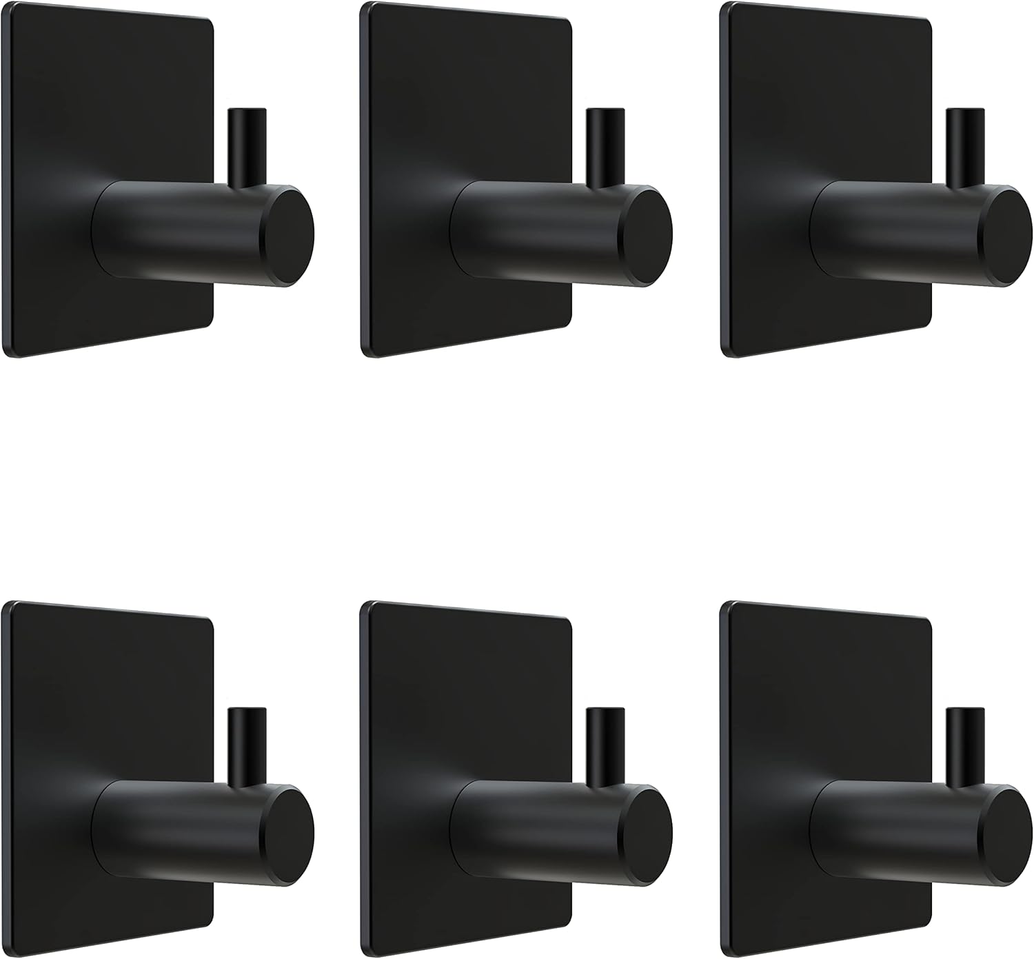 Matte Black Self Adhesive Towel Hooks for Bathroom Wall Door Mounted - SUS304 Stainless Steel Strong Strips Stick on 3M Wall Hooks for Hanging Coat, Hat, Bag, Key, Jacket – 6 Pack