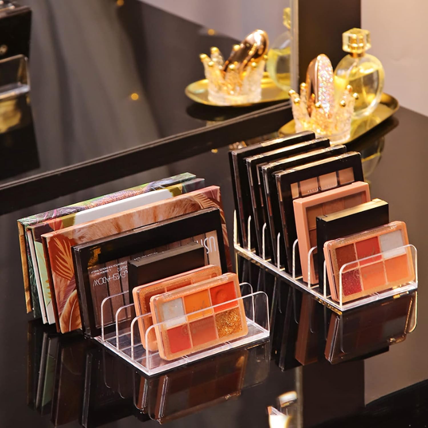 - ACRYLIC MAKEUP ORGANIZER: Made of high-transparency material. Neatly store and easily see and reach your palettes or other items. Raised transparent dividers ensure that your most-loved makeup palettes stay upright and are always visible and accessible.