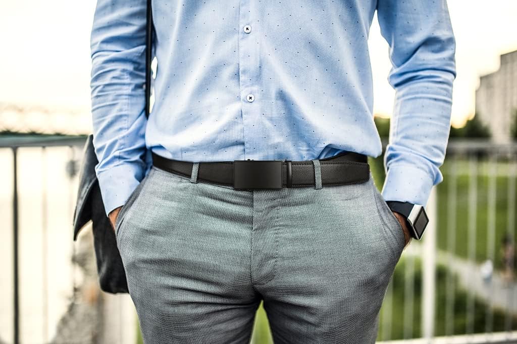 - EAST TO USE BELT FOR MEN:Just slide the dress belt into the sliding buckle and pull leather belt through, the ratchet buckle auto-locks.To release the ratchet belt, gently push the release lever on the side of the automatic buckle and lock will snap. Simple, smooth and sleek.