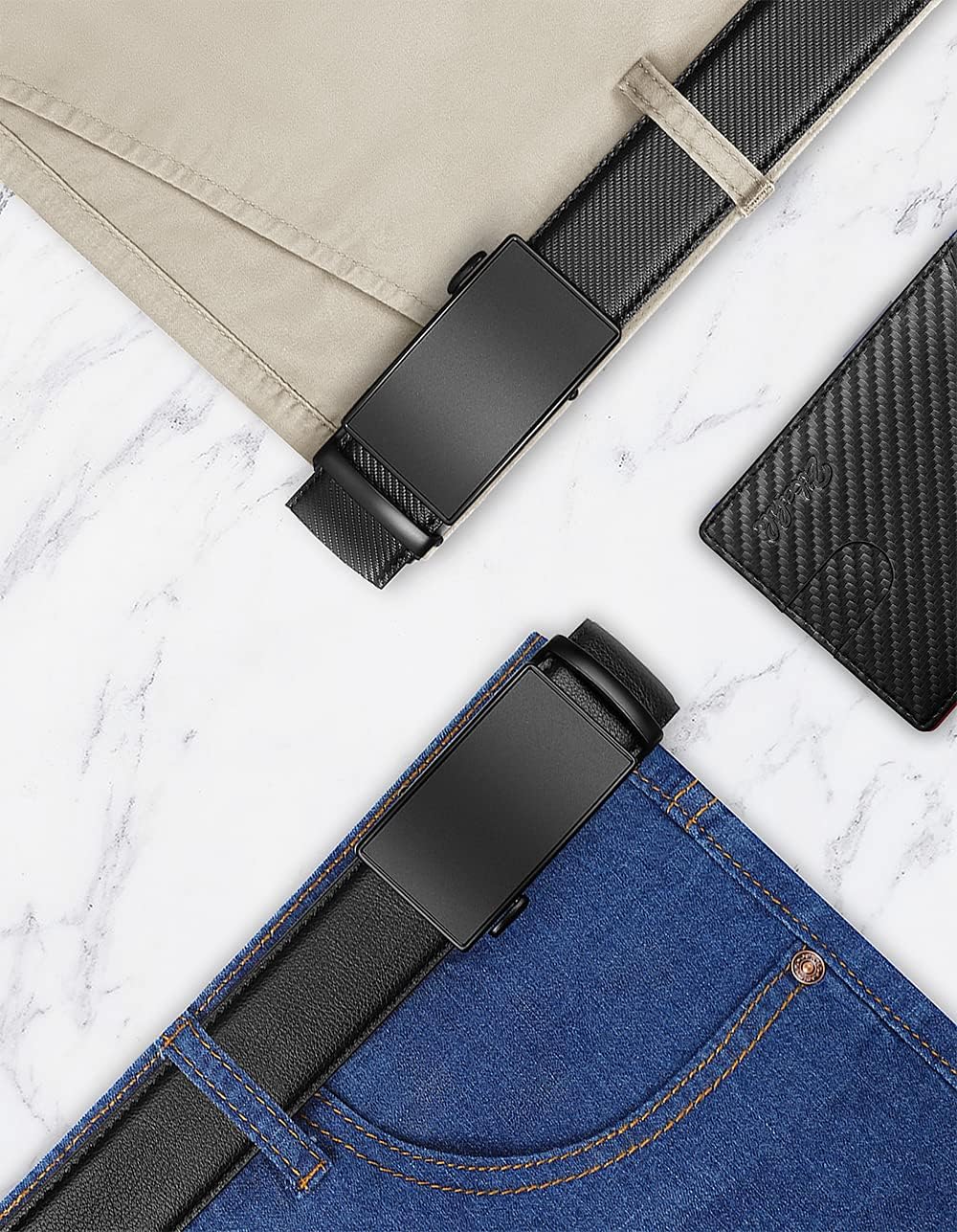 • EAST TO USE BELT FOR MEN:Just slide the dress belt into the sliding buckle and pull leather belt through, the ratchet buckle auto-locks.To release the ratchet belt, gently push the release lever on the side of the automatic buckle and lock will snap. Simple, smooth and sleek.