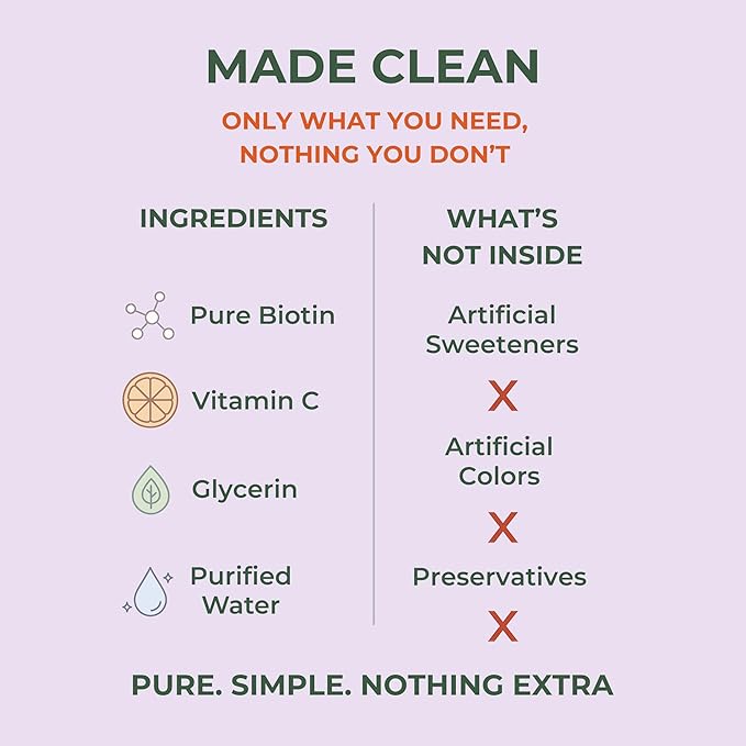 - Pure, Clean Formula – No Fillers or Artificial Additives: Made with biotin, vitamin C, usp vegetable glycerin, and purified water. No sugar, gluten, soy, dairy, preservatives, or artificial sweeteners.