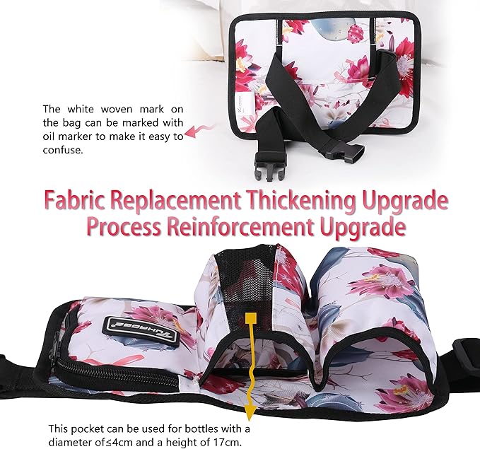 - 4、There are two big pockets and one small pocket in front which can be temporarily replaced with bottles of different capacities. The two big pockets can be used with bottles of diameter ≤2.36inch and height 9.45inch. One of them is made into a pocket in the form of mesh cloth, which is convenient to watch the capacity of the bottle; In addition, a small pocket can be used for a bottle with a diameter ≤1.57inch and a height of 6.69inch;