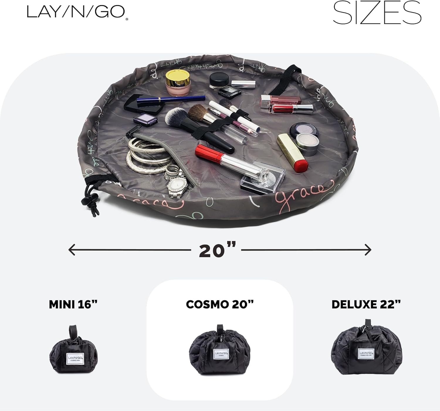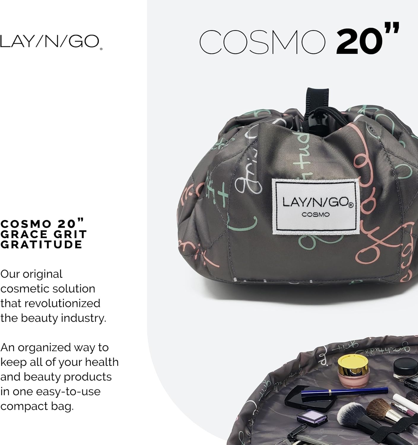 Lay-n-Go Cosmo Drawstring Cosmetic & Makeup Bag Organizer - Portable Drawstring Makeup Bag w/Zipper Pocket & More - Durable, Machine Washable Toiletry Bag for Travel (20", Grit Grace Gratitude)