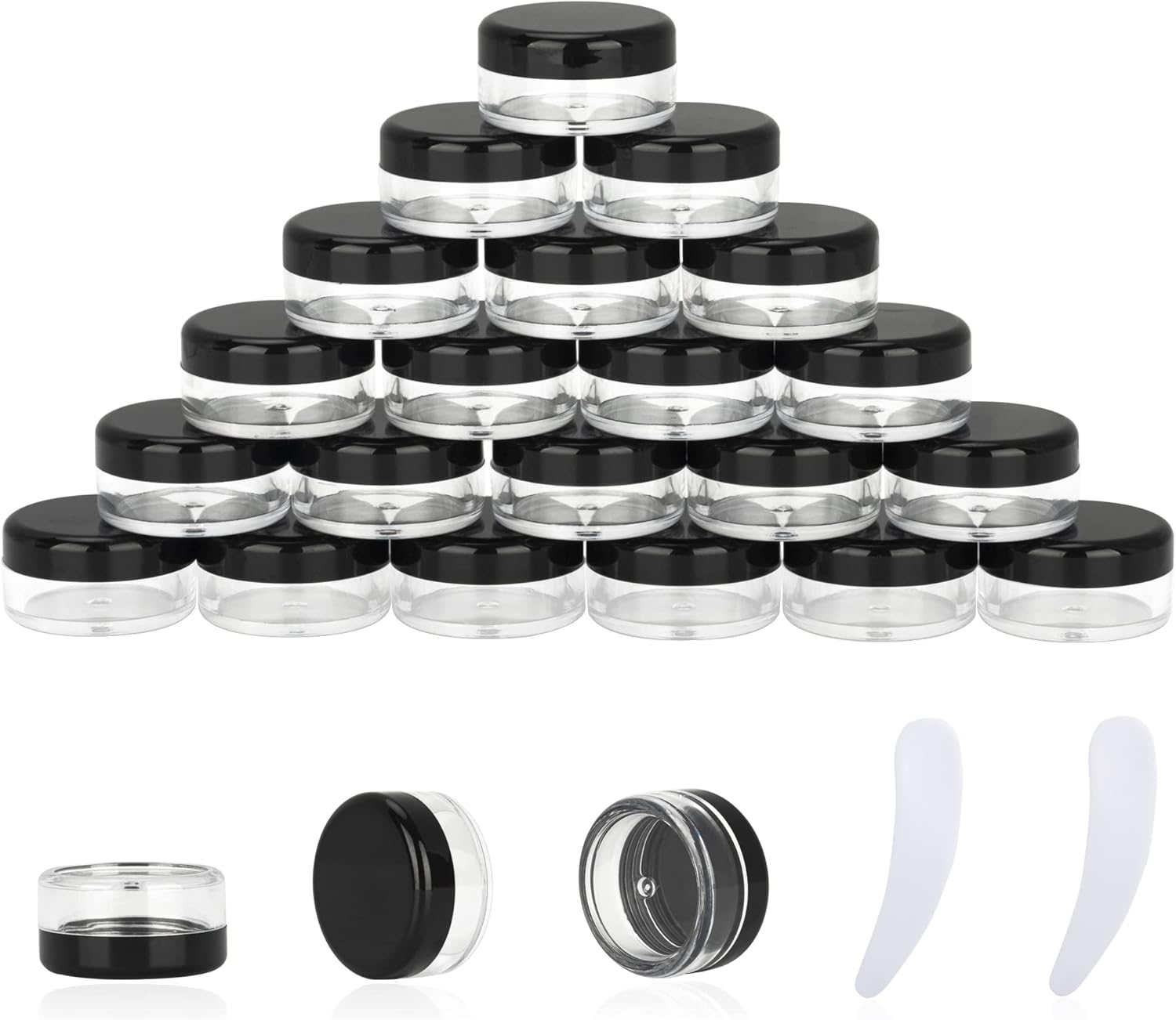 25PCS 3 Gram Sample Containers, 3ml Empty Jars with Lids, Small Cosmetic Containers, Mini Sample Jars with 2PCS Mini Spatulas for Make Up, Oils, Lotion, Powder, Paint, Jewelry, Lip Balms(Black Lid)