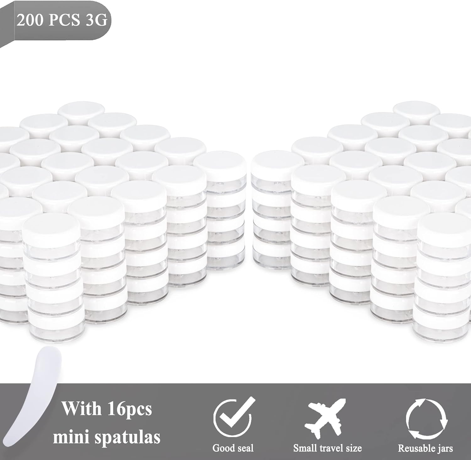 200PCS 3 Gram Sample Containers, 3ml Empty Jars with Lids, Small Cosmetic Containers, Mini Sample Jars with 16PCS Mini Spatulas for Make Up, Oils, Lotion, Powder, Paint, Jewelry, Lip Balms(White Lid)