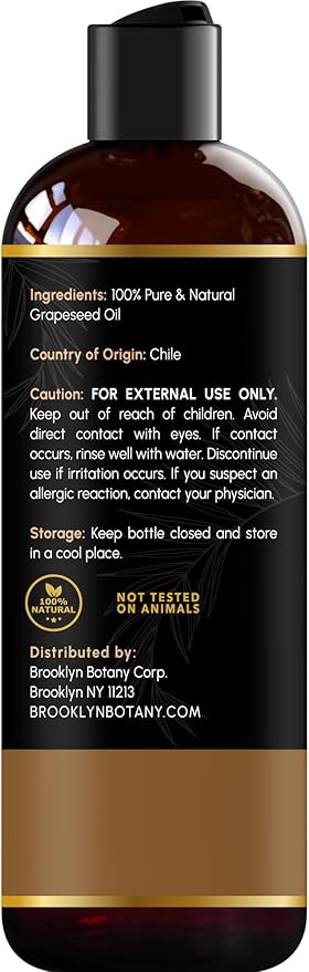 Brooklyn Botany Grapeseed Oil - 100% Pure and Natural Body, Hair, and Face Carrier Oil for Essential Oils, Aromatherapy, and Massage - 8 fl Oz