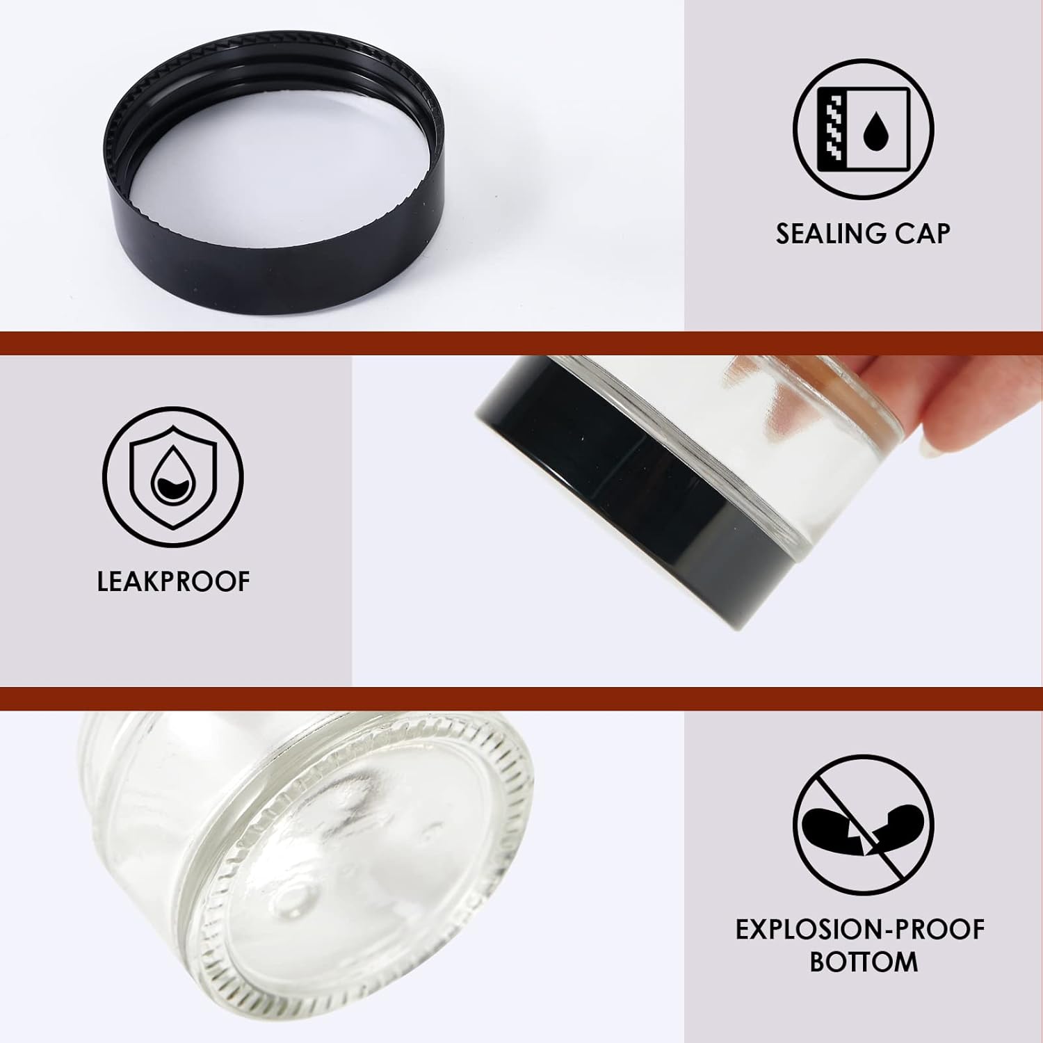 - Airtight and Leak Proof: Don't worry about getting your cosmetic bag wet! The travel cream jar's tight thread fits nicely with the glass bottle cap to protect the lotion and essential oil from leaking. Our empty airtight glass jars can be reused to reduce waste