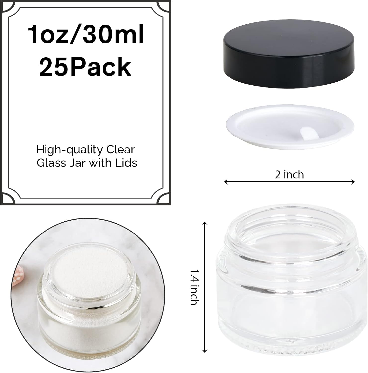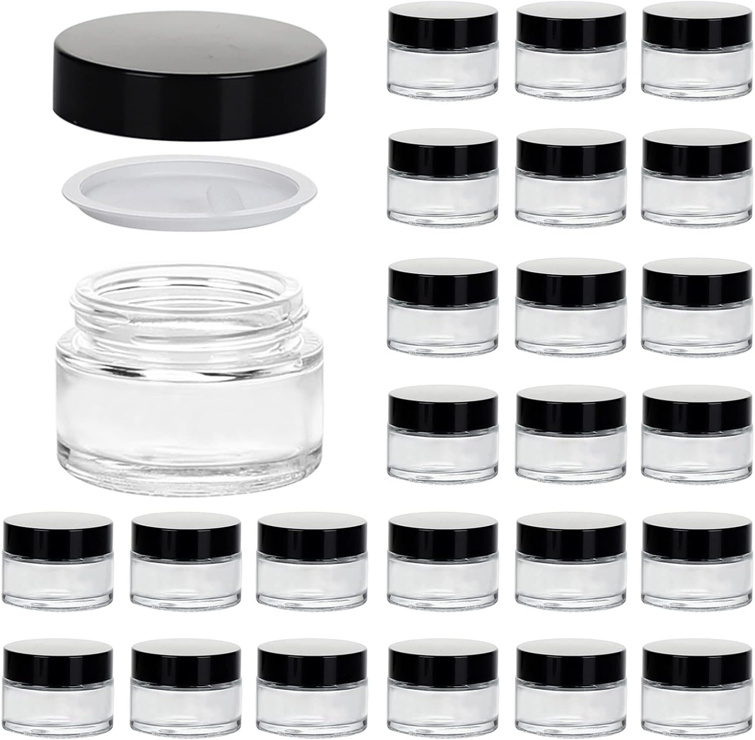 1oz Glass Jar with Lid, Hoa Kinh 25Pack Clear Round Containers Cosmetic Glass Jars with Inner Liners and Black Lids Travel Jars for Storing Lip and Body Scrub, Lotion, Body Butter, Bath Salts, Liquid