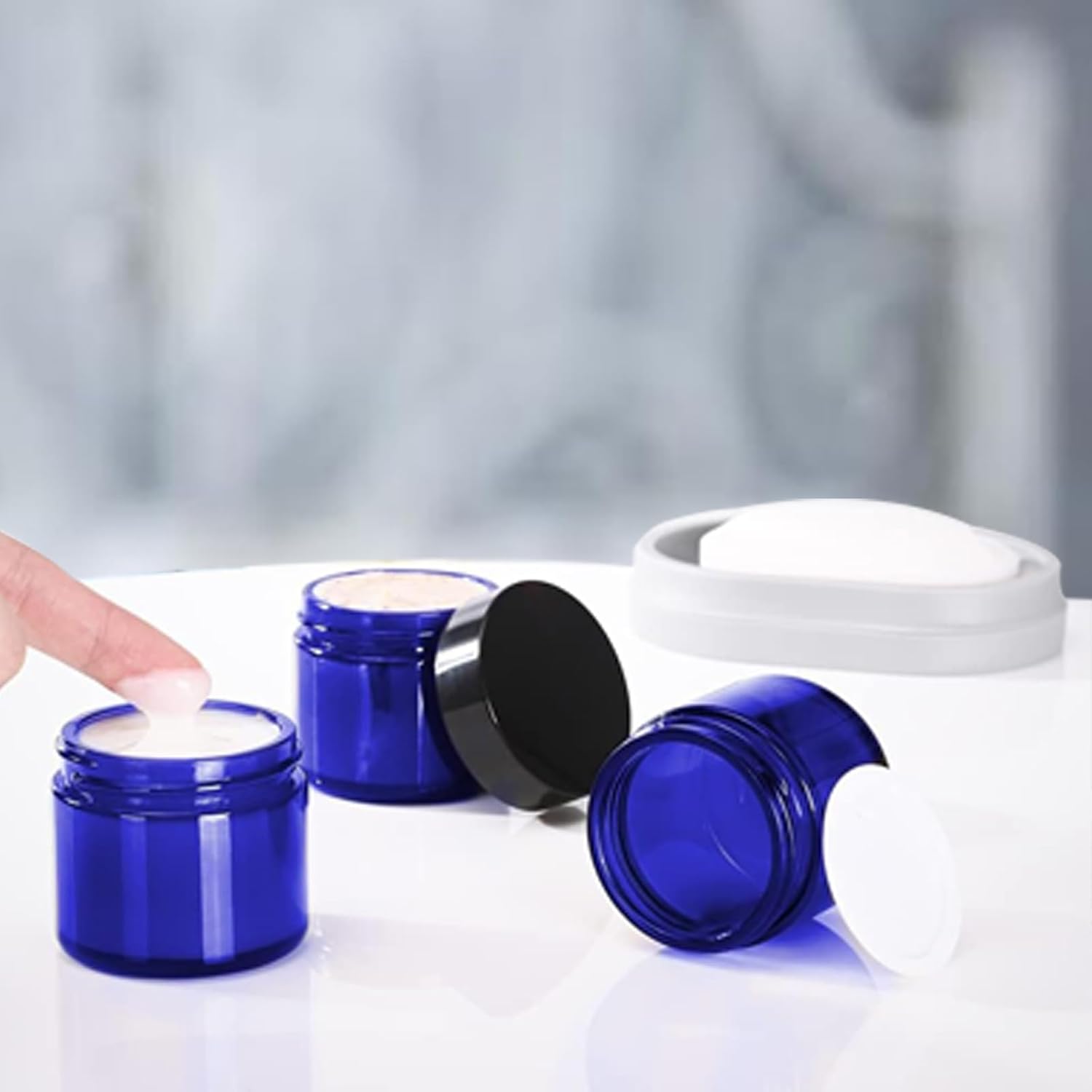 - Well manufactured 1 oz blue glass cosmetic containers with lids. Came with inner liners, the additional inner cap helps prevent leaks