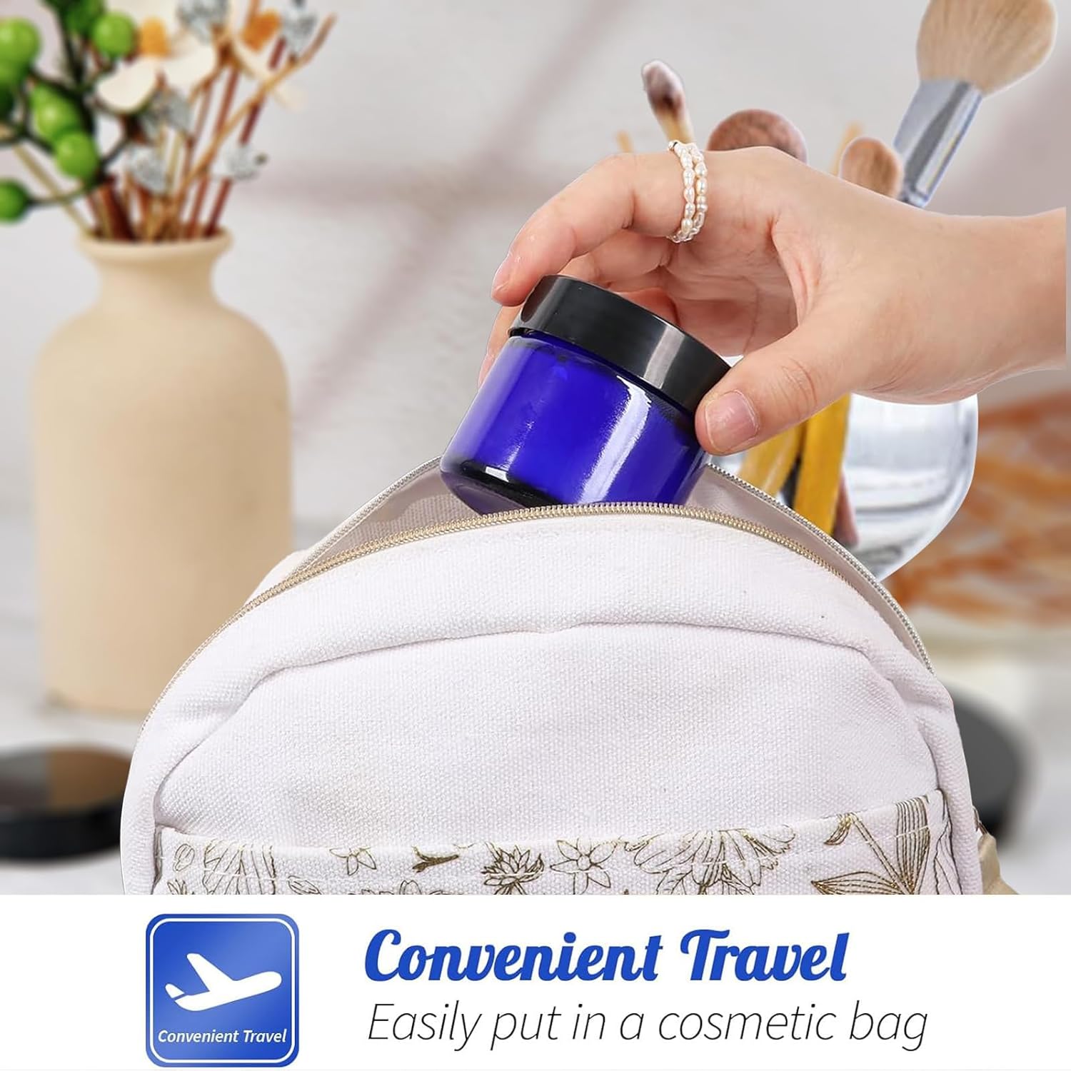 24 Pack 1 oz Round Blue Glass Cosmetic Jars with Inner Liners and Black Lids, Travel Glass Jars, Cosmetic Containers for Lip Balms, Powders, Makeup, Cream, Eyeshadow, Slime, Paint