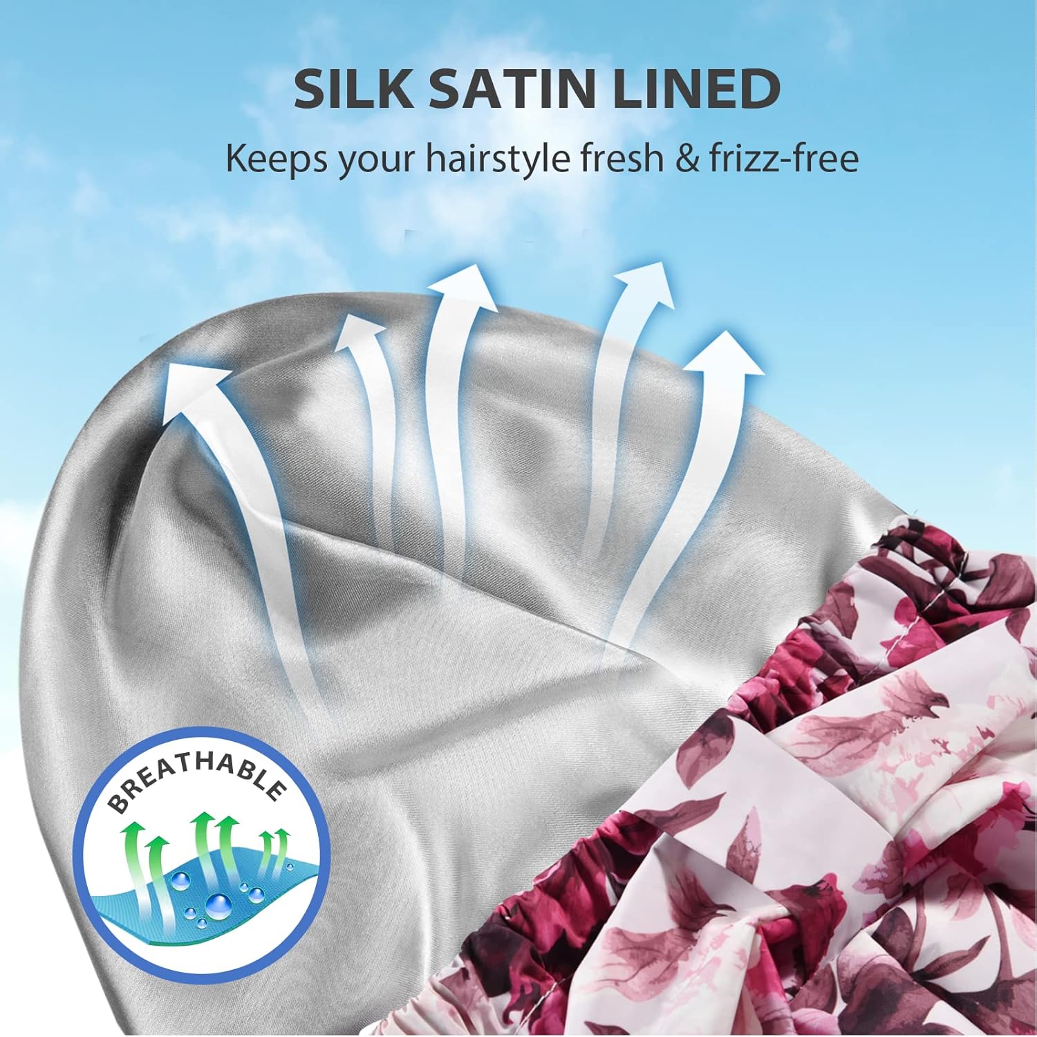 - Breathable & Reusable Hair Cap: The outer layer of INNELO shower cap is a waterproof fabric and the inner lining is a soft and smooth satin, which gently glides over the hair to protect your hair from the dryness caused by friction, reduce hair frizz, tangles and thinning. Suitable for women with curly, frizzy, braids, wigs, dreadlocks day or night, also for long thick hair girls.
