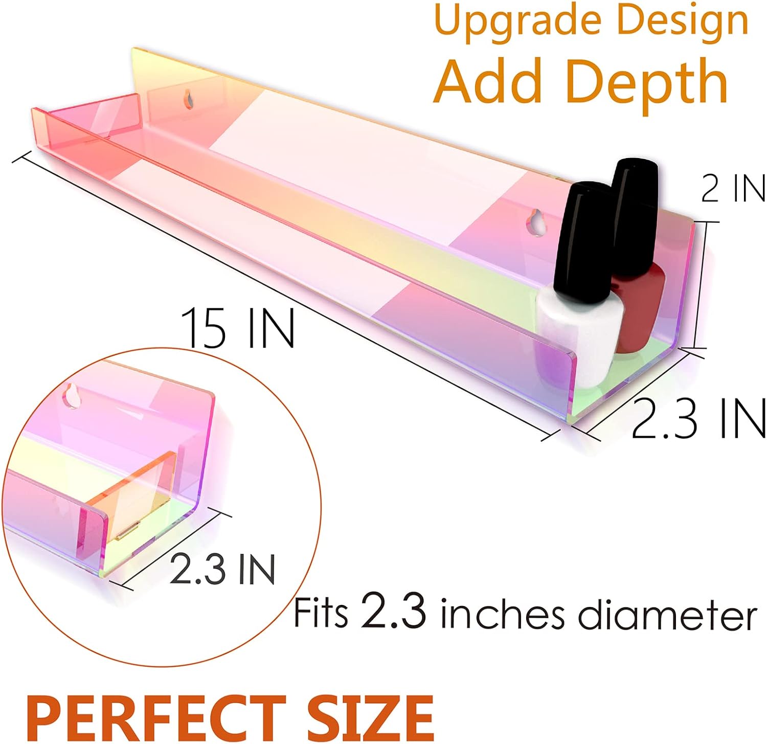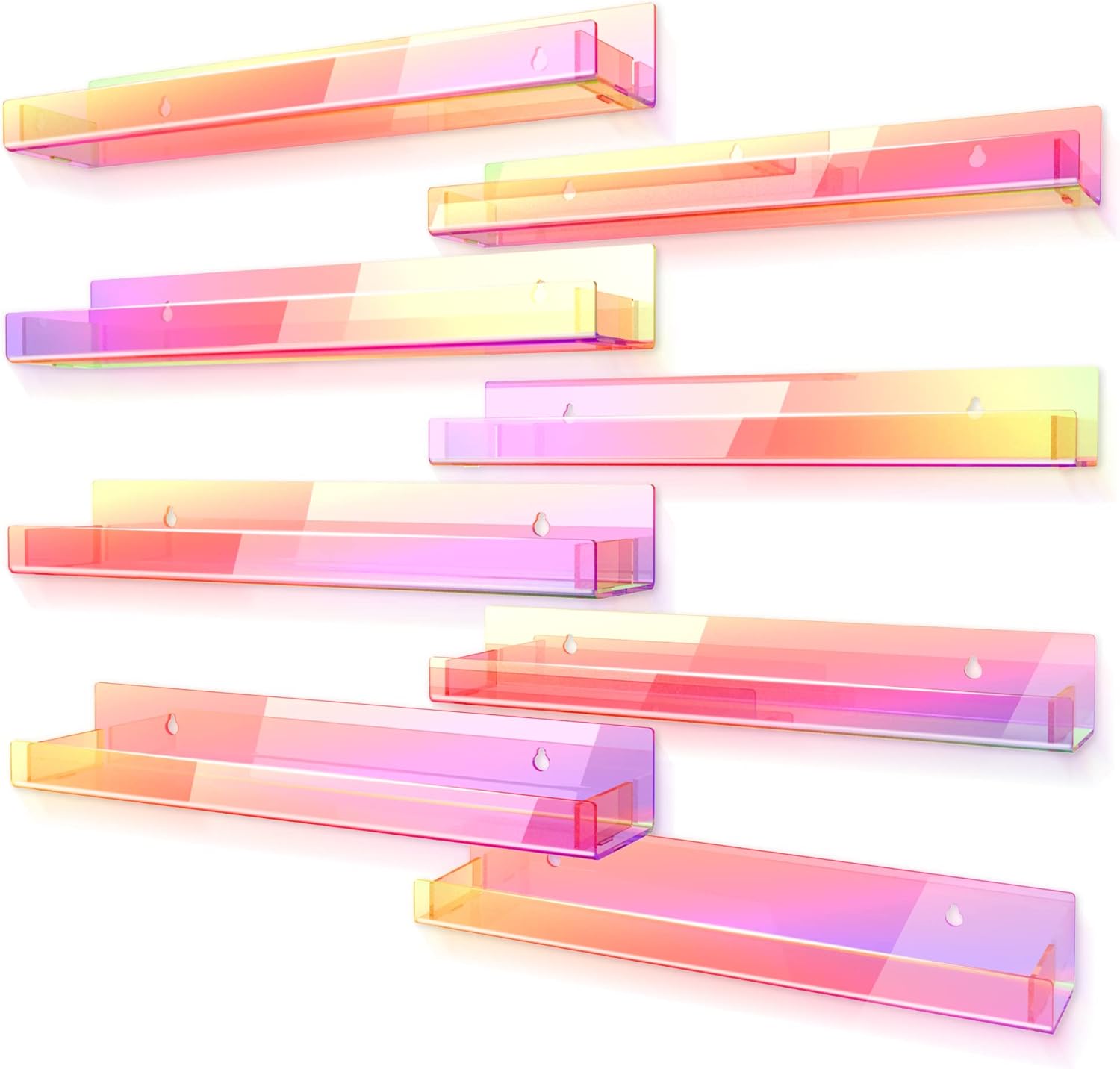 8 Pack 15 Inch Iridescent Acrylic Shelves, Clear Rainbow Kids Floating Bookshelf for Kids Room, Modern Sunglasses Essential Oil Picture Ledge Display Toy Storage Wall Shelf
