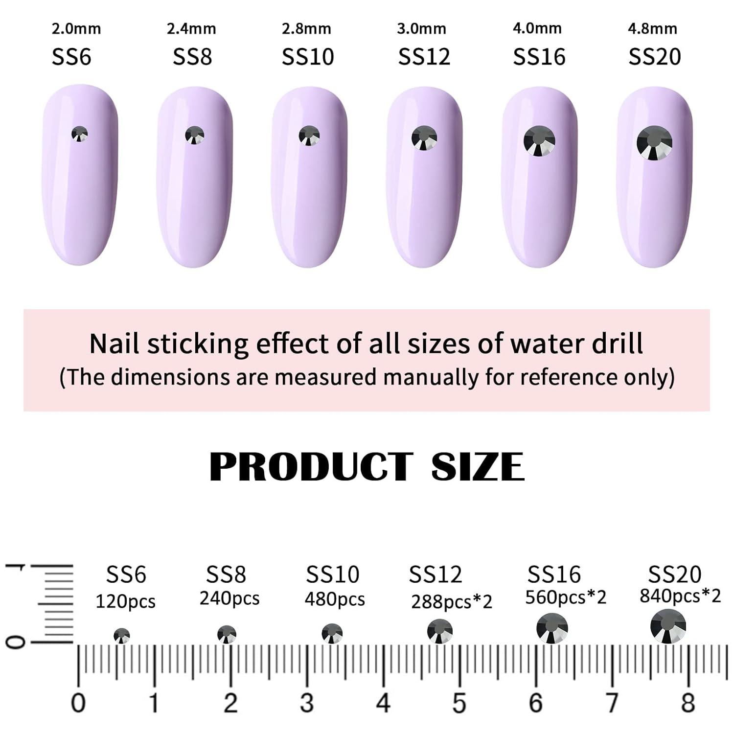 - ๐Product Packaging: Box Packaging SS6 2MM - 1680 Pcs, SS8 2.4MM - 1120 Pcs, SS10 2.8MM - 600 Pcs, SS12 3MM - 480 Pcs, SS16 4MM - 240 Pcs, SS20 4.8MM - 120 Pcs, 1 pcs Tweezers and 1 pcs Picking Pen.
