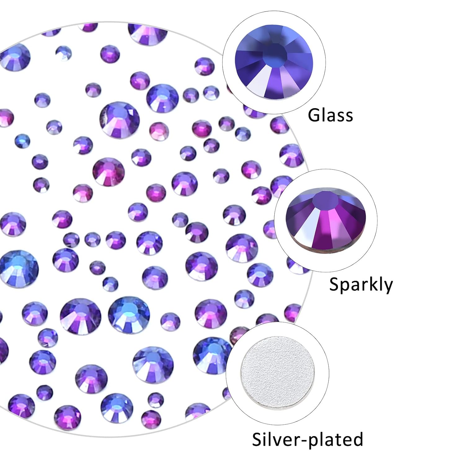 - ๐Material: glass/artificial crystal. The surface has a high-precision section, multi-faceted cutting, high brightness and high gloss. Flat bottom, round shape, silver plated back, non-allergenic. The color runs through the rhinestones without fading.