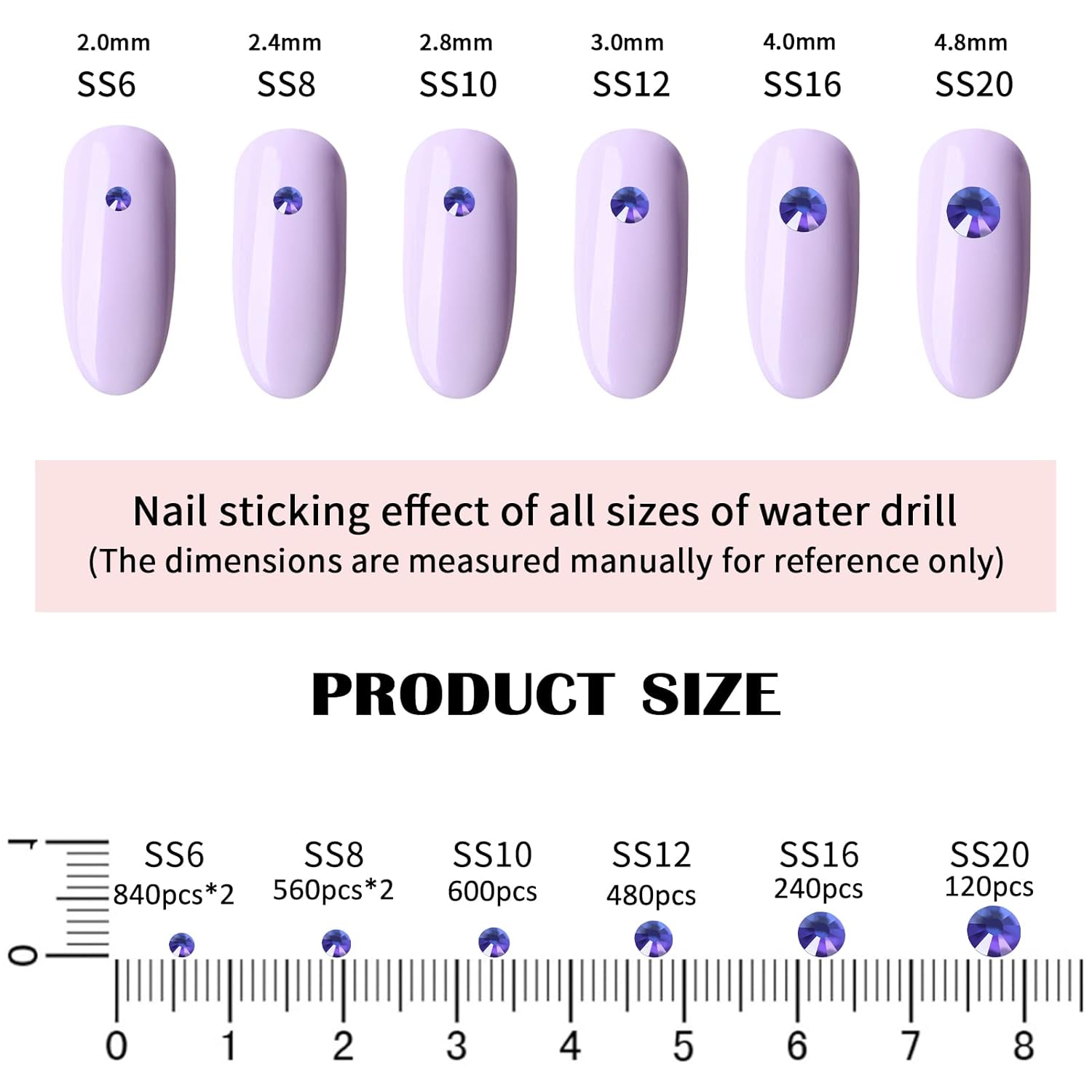 - ๐Product Packaging: Boxed SS6 2MM - 1680 Pcs, SS8 2.4MM - 1120 Pcs, SS10 2.8MM - 600 Pcs, SS12 3MM - 480 Pcs, SS16 4MM - 240 Pcs, SS20 4.8MM - 120 Pcs, 1 pcs Tweezers and 1 pcs picking pen.