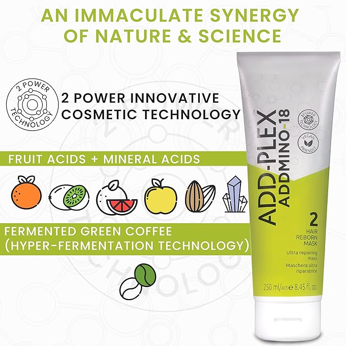 - REPAIR MASK FOR DAMAGED HAIR: Intensive repairing and nourishing mask that deeply moisturizes hair and prevents damage caused by chemical services and external agents. The ADDMINO-18 hair products' new technology strengthens, protects, and hydrates the hair due to the combination of fruit acids, mineral salts, and fermented green coffee extract.