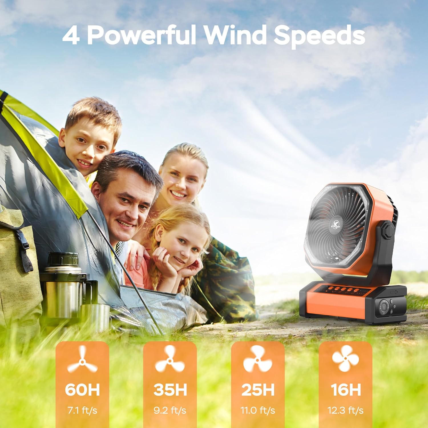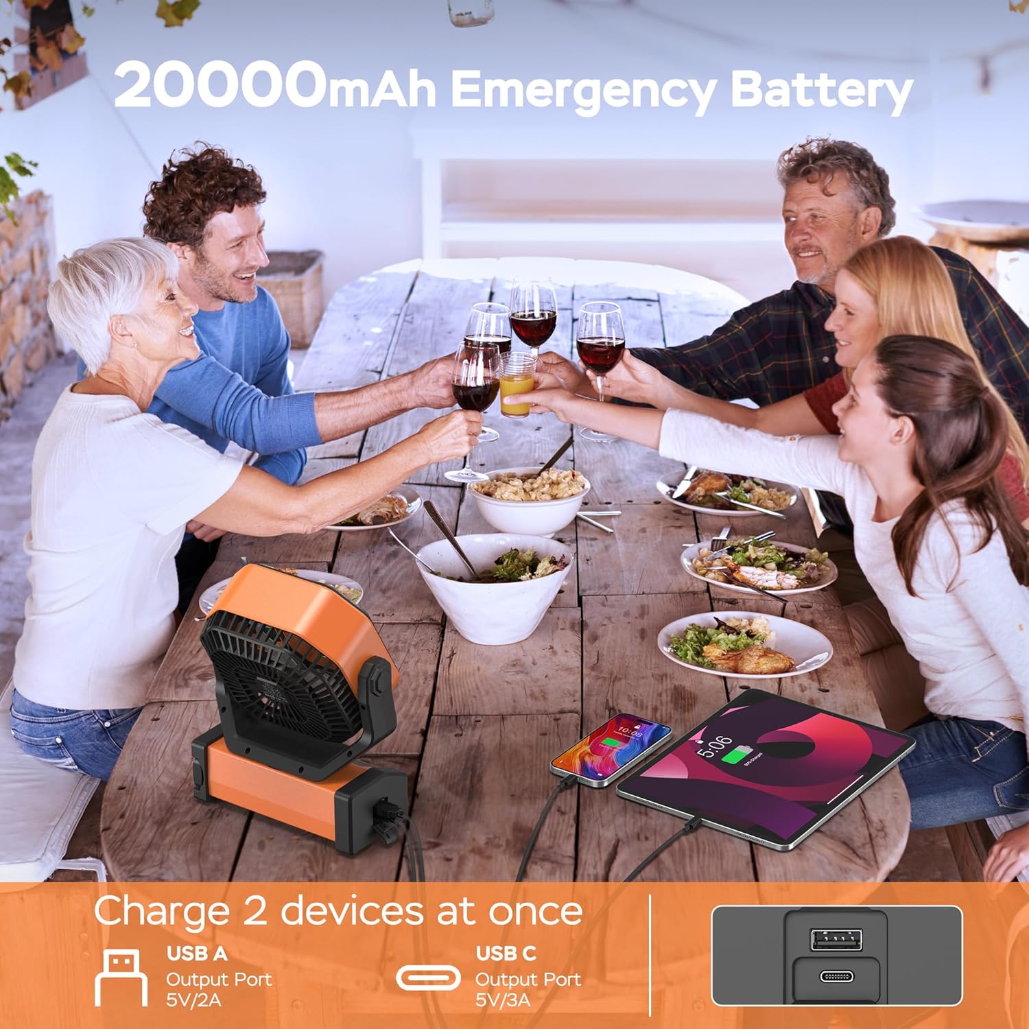 - Long-lasting Battery: The camping fan features a 20000mAh built-in battery with up to 60 hours of runtime on the lowest wind speed. Equipped with USB output ports for charging phones or other devices during power outages or outdoor adventures