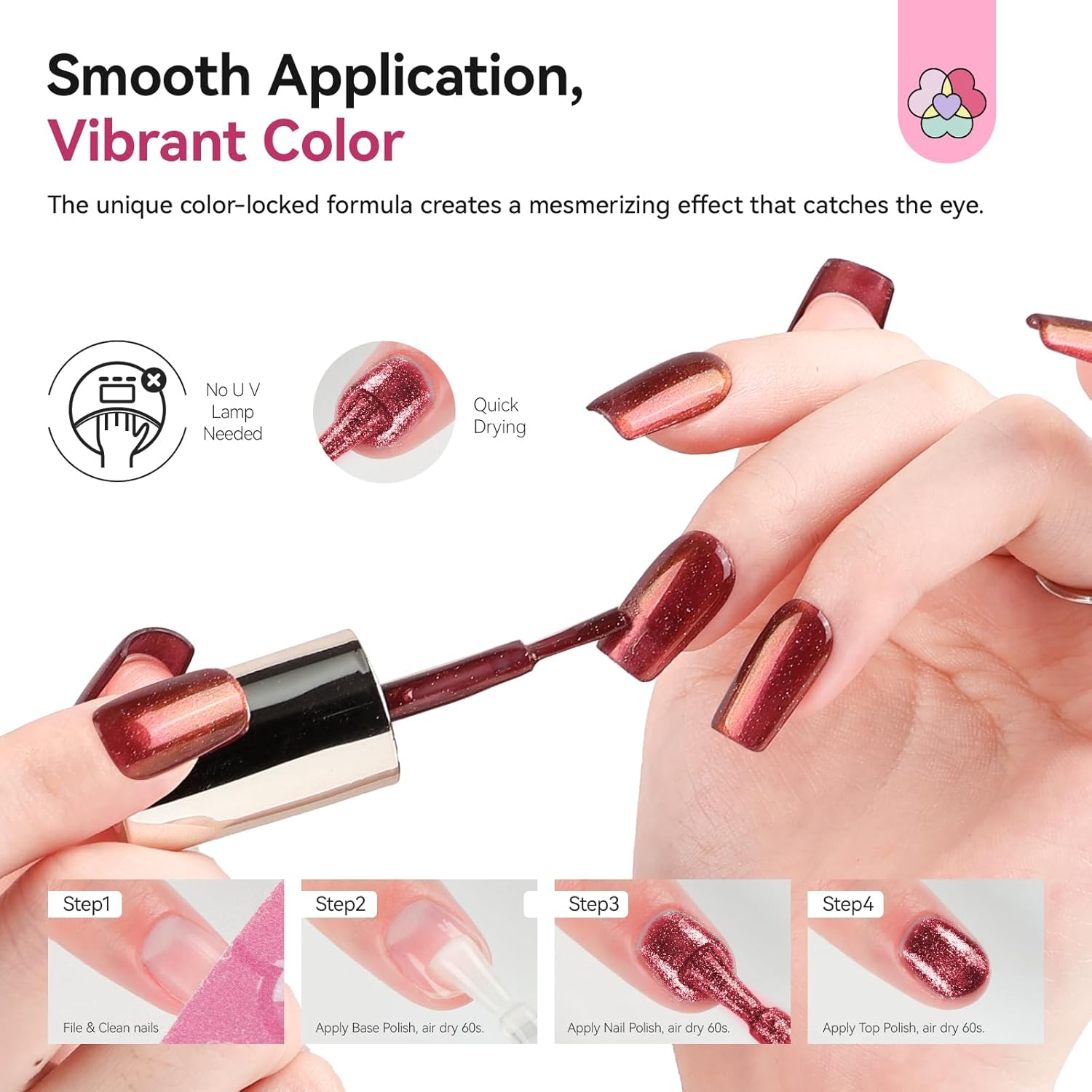 - Easy Application: Natural formula with high pigmentation glides smoothly. Follow 4 steps: base coat > black polish > chameleon polish > top coat. Allow 60 seconds drying per layer (3-4 minutes final cure) for optimal chameleon effect activation