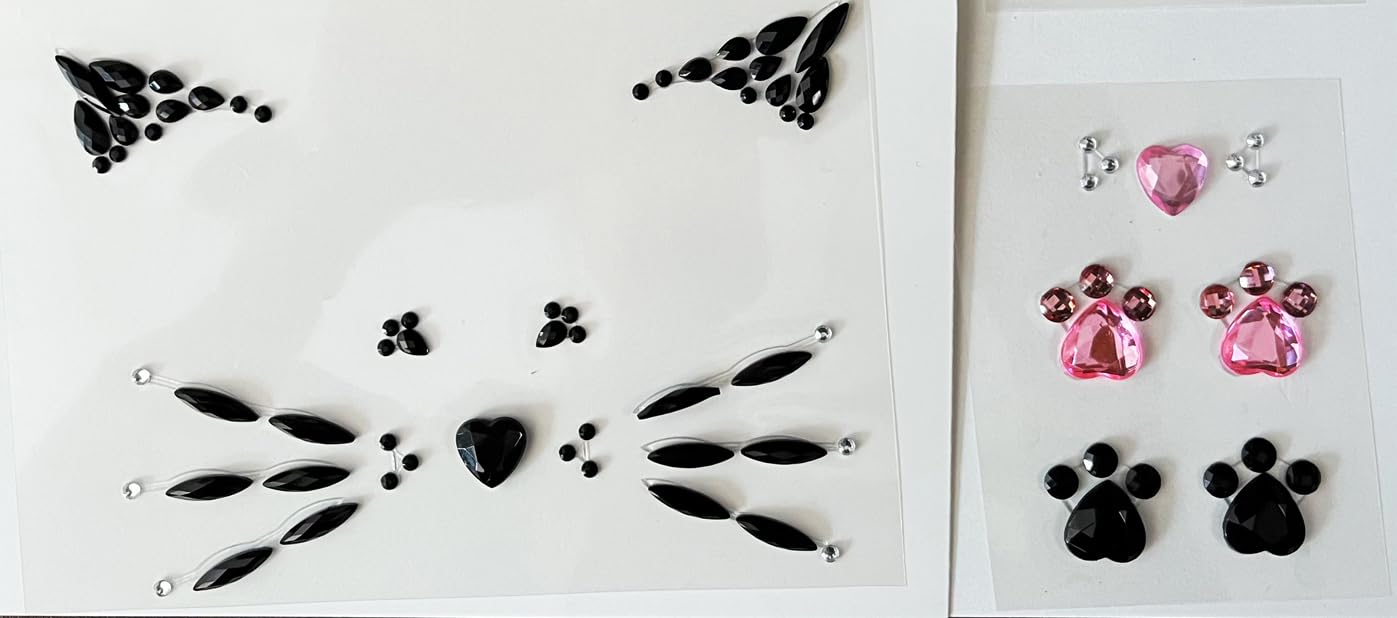 - Rhinestone Halloween Cat Face Jewels - 1 cat face gems sticker and 1 cat print jewels tattoo. Complete your festival outfit off with these amazing gems! Use these crystal holographic face jewels along with glitter to accent your beautiful makeup