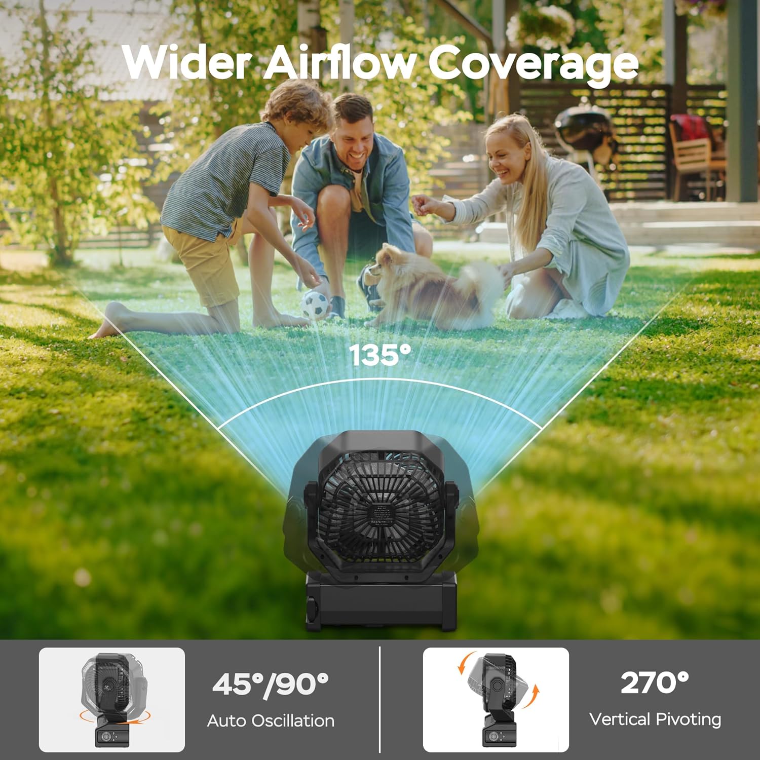 - Wide-angle Oscillation: The desk fan can oscillate within 45°/90°automatically, covering a larger wind area of 135°to cooling more people at the same time. The 8-inch fan head can also pivot within 270°,ensuring it blows in the direction you want