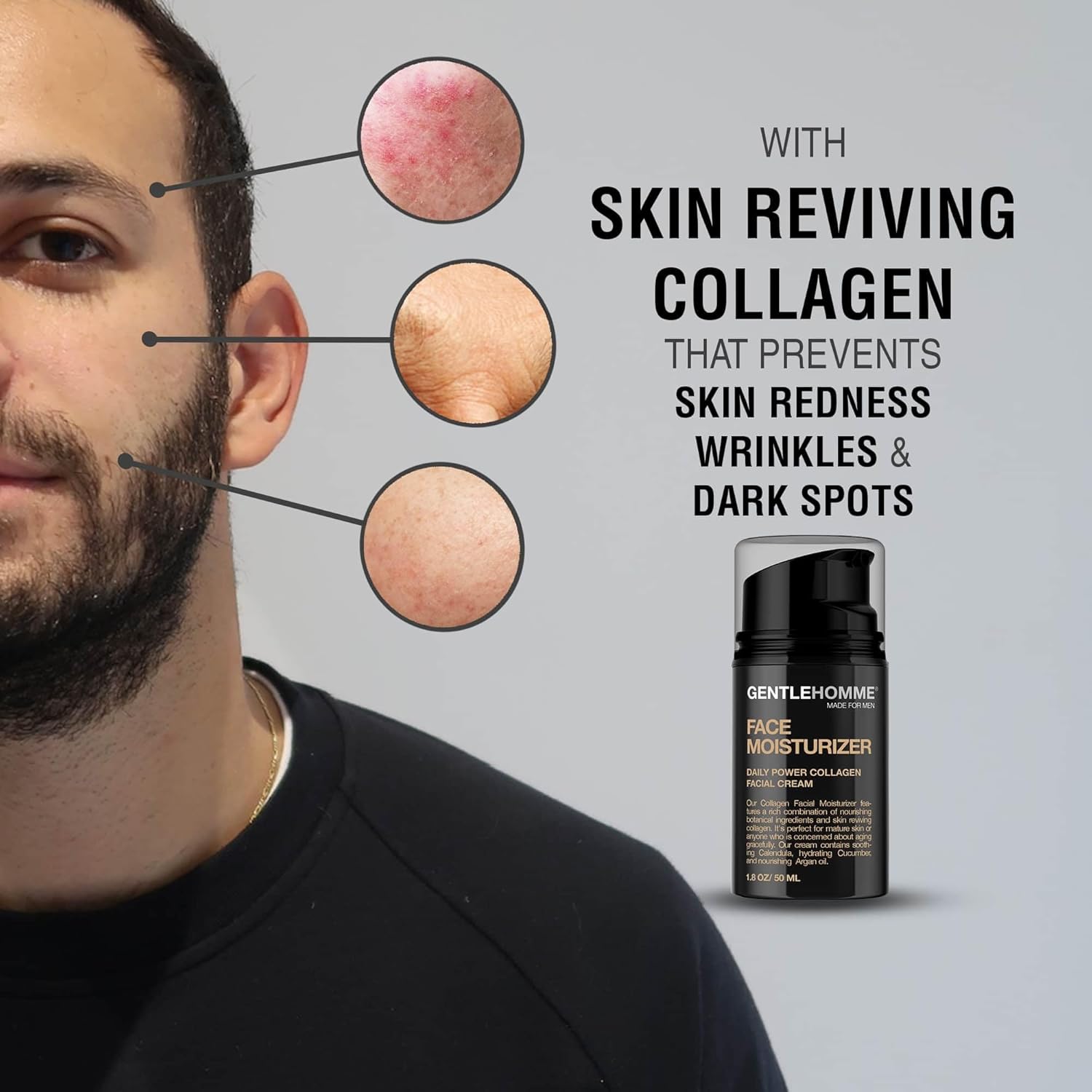 - COLLAGEN MOISTURIZER FOR MEN - Gentlehomme Collagen Face Moisturizer features a rich combination of nourishing botanical ingredients and skin-reviving collagen. Our formula helps to prevent wrinkles, dark spots and skin redness, providing total hydration to your skin.