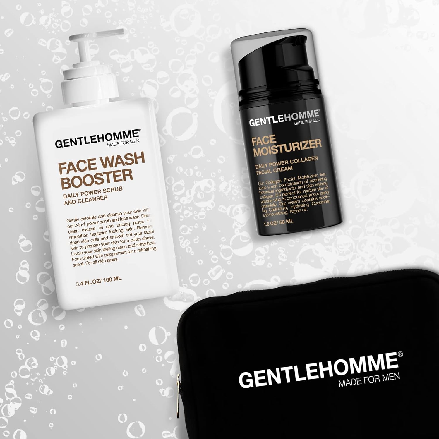 - FACE TRAVEL KIT - Gentlehomme Face Travel Kit is our men’s on-the-go skincare set that includes our Travel Pouch, Collagen Face Moisturizer and Face Wash Booster. Perfect for travel, this skin care kit for men leaves your skin feeling clean, refreshed and moisturized.