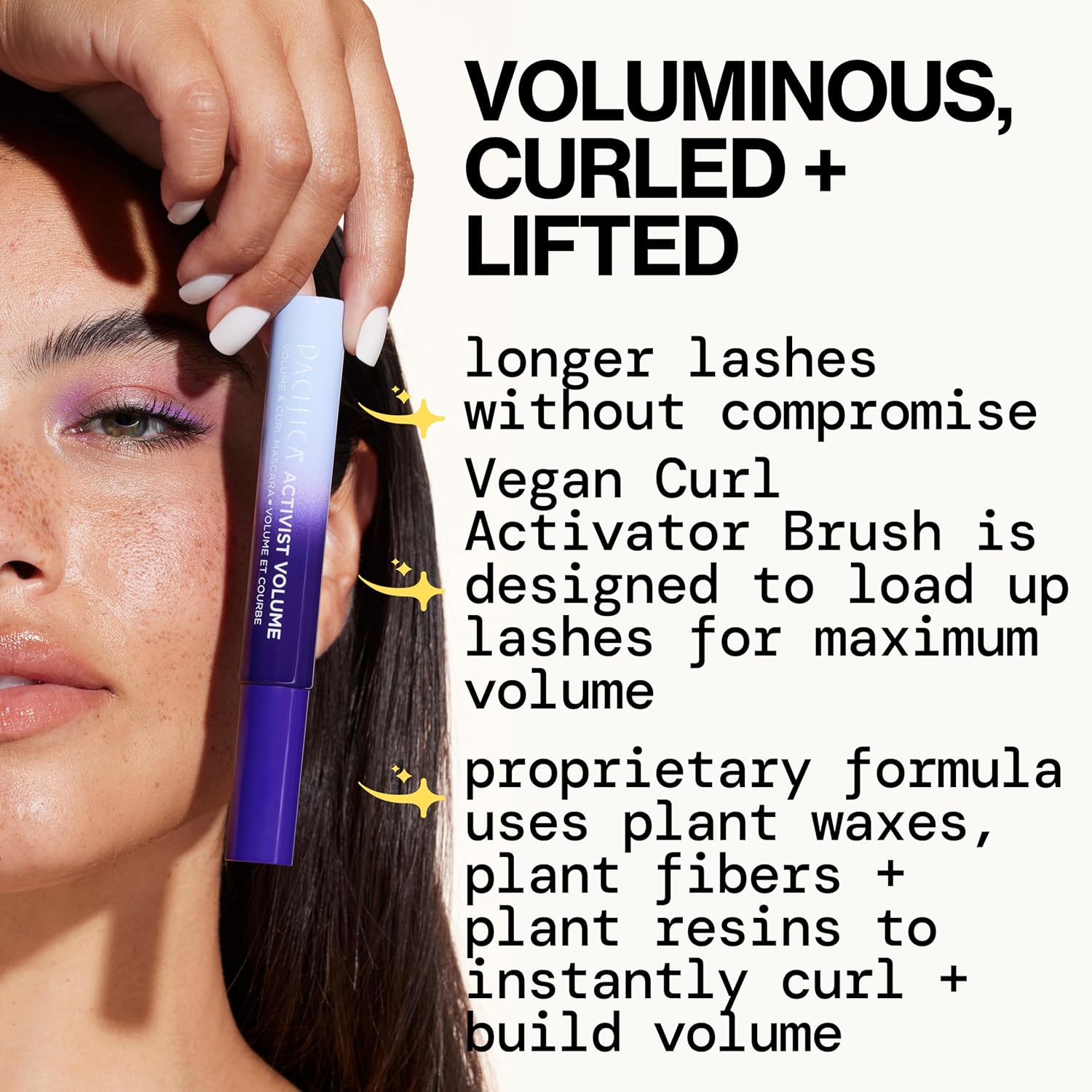 - ACTIVIST VOLUME & CURL MASCARA Lashes that make an impact. Voluminous, curled, lifted, longer lashes without compromise. This compassionately clean mascara uses 96% naturally derived ingredients and comes in a pretty custom glass bottle designed for less plastic waste.