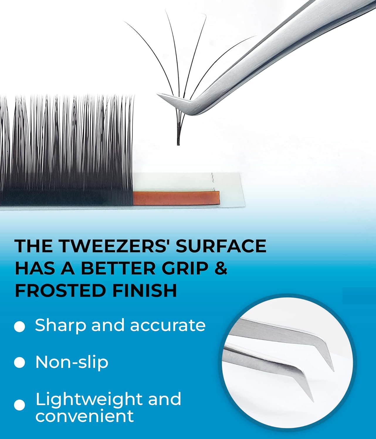 - CONVENIENT & TOP-GRADED - These professional lash extension tweezers are made of anti-magnetic material. The stainless steel surface has a non-slip frosted finish with a better grip and a sophisticated look. Easily used and sterilized.