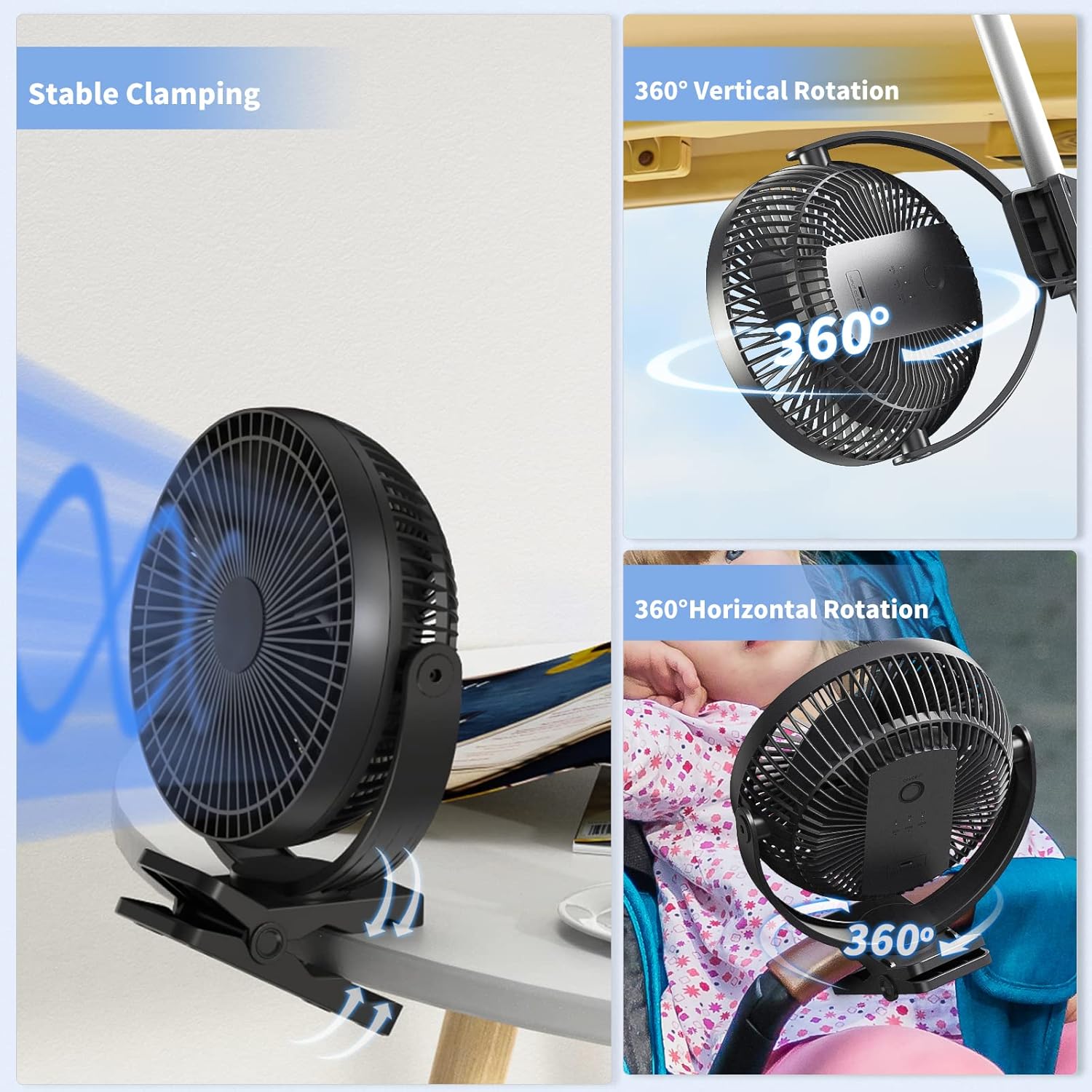 Clip on Fan, Rechargeable Portable Fan, 8 Inch Small Desk Fan - 10000mAh Battery Powered Fan with 4 Speed, 360° Rotation Personal Fan Suitable for Golf Cart, Bedroom, Travel and Camping (Black)