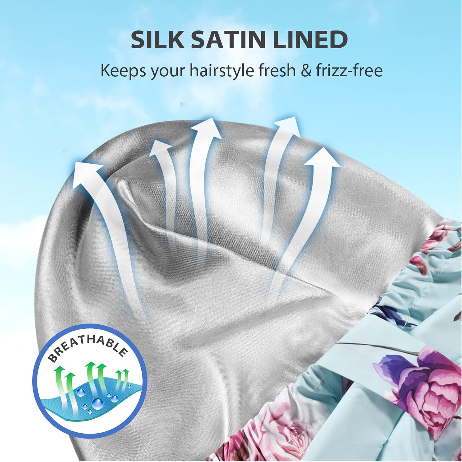 - Breathable & Reusable Hair Cap: The outer layer of INNELO shower cap is a waterproof fabric and the inner lining is a soft and smooth satin, which gently glides over the hair to protect your hair from the dryness caused by friction, reduce hair frizz, tangles and thinning. Suitable for women with curly, frizzy, braids, wigs, dreadlocks day or night, also for long thick hair girls.