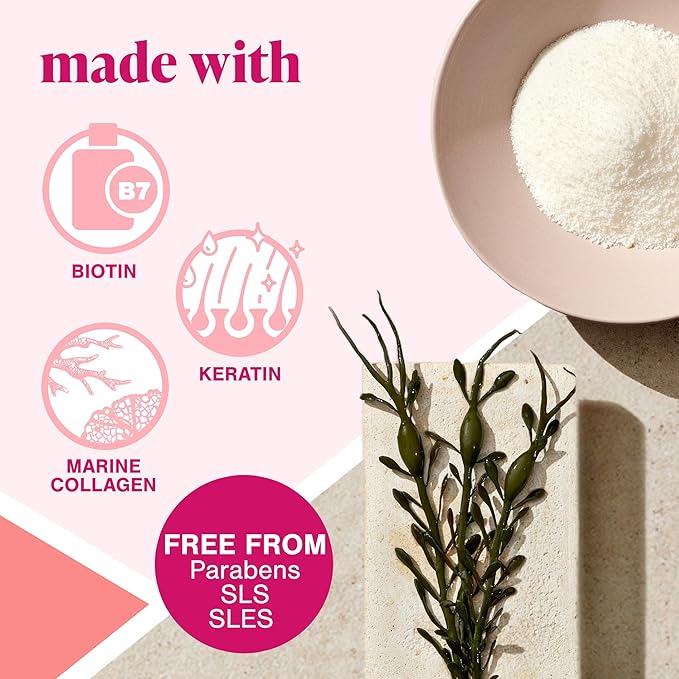 - Includes a proprietary complex that contains seaweed, marine collagen, biotin, and keratin