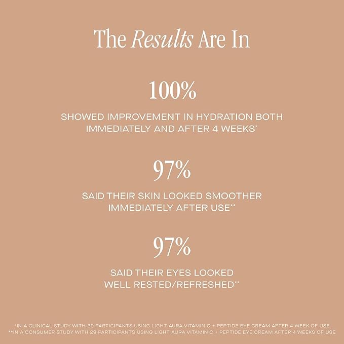 - The Results Are In - In a clinical study with 29 participants using Light Aura Vitamin C + Peptide Eye Cream, 100% showed a measured improvement in hydration both immediately and after 4 weeks.